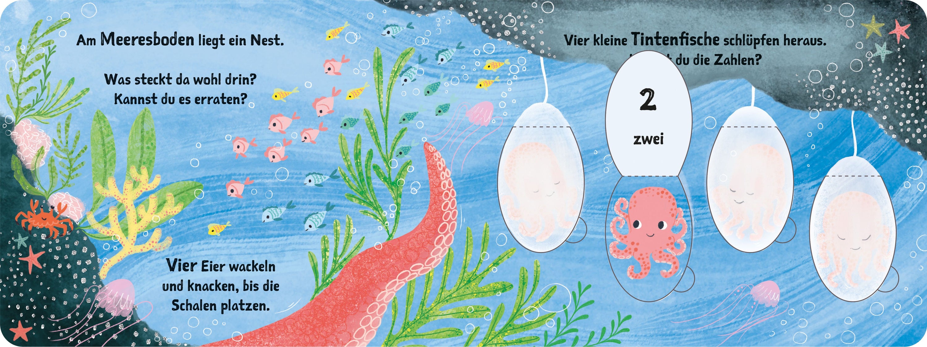 Dieses Papp-Bilderbuch bringt neugierigen kleinen Entdeckern die Welt der Zahlen spielerisch näher. Auf jeder Doppelseite verstecken sich unter den Klappen eine Schildkröte, zwei Schnabeltiere, drei Krokodile, vier Tintenfische und fünf Küken - und laden zum Staunen, Zählen und Mitmachen ein!