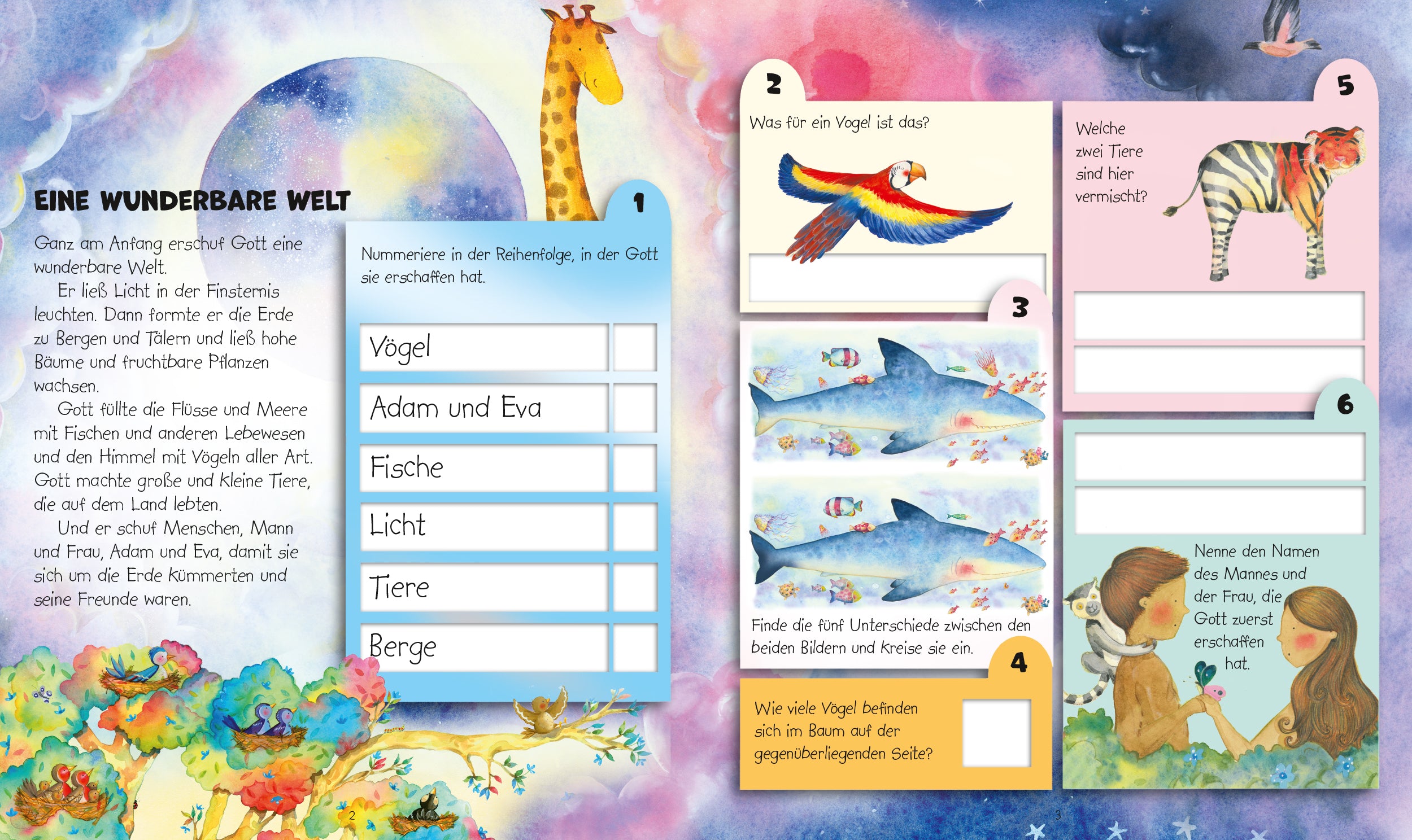 Von der Schöpfungsgeschichte, über den Bericht über die Israeliten bis hin zum Leben von Jesus, erzählt die Autorin anschaulich und einfühlsam die biblischen Geschichten nach. Die elementaren und farbenfrohen Illustrationen unterstützen das schnelle Verständnis der Erzählungen.