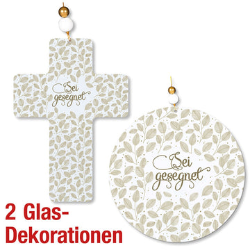 1 x runde Glas-Dekoration ( 12 cm) und 1 x Glas-Kreuz (10 x 14,4 cm).