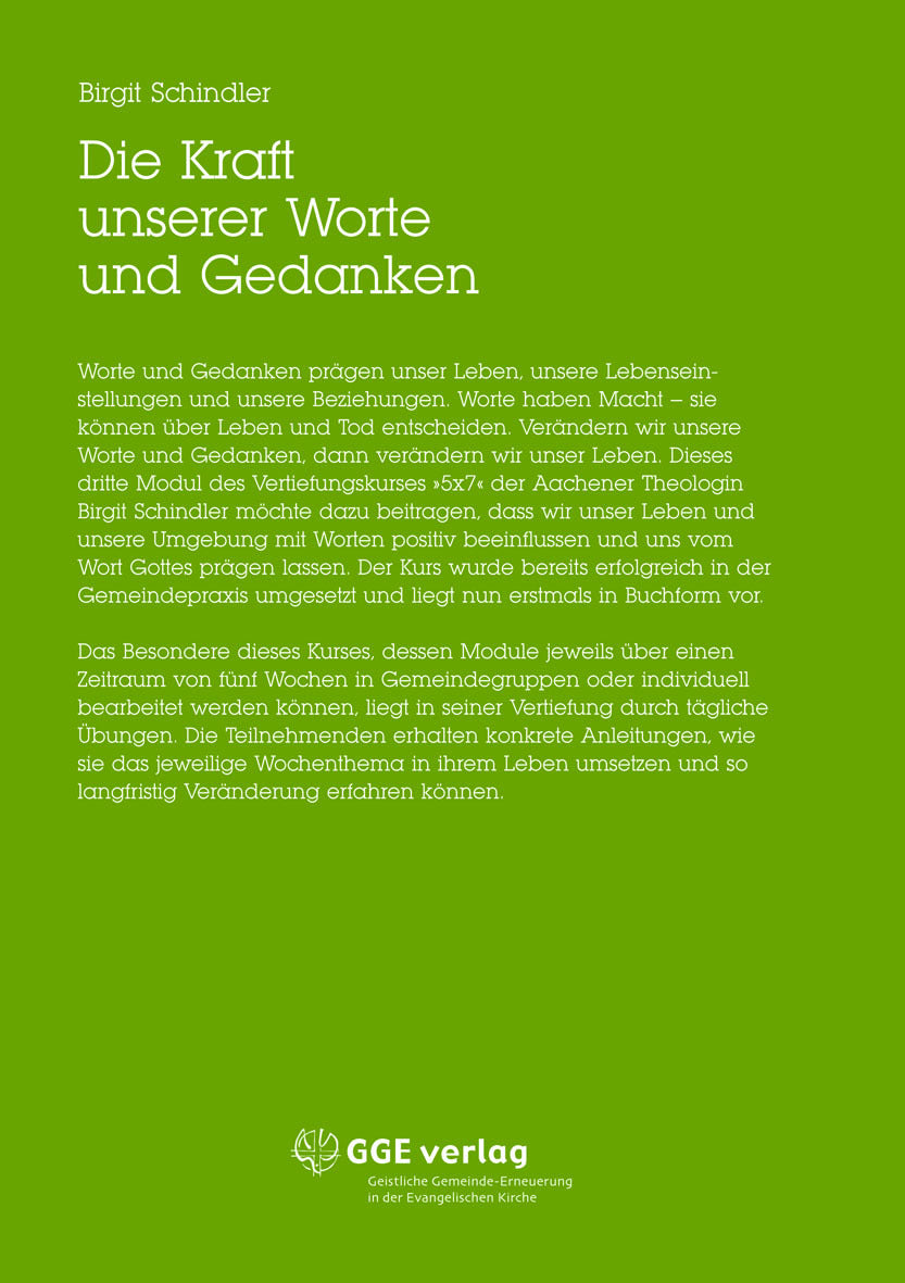 Worte und Gedanken prägen unser Leben, unsere Lebenseinstellungen und unsere Beziehungen. Worte haben Macht, sie können über Leben und Tod entscheiden. Verändern wir unsere Worte und Gedanken, dann verändern wir unser Leben. Dieses dritte Modul des Vertiefungskurses "5x7" möchte dazu beitragen, dass wir unser Leben und unsere Umgebung mit Worten positiv beeinflussen und uns vom Wort Gottes prägen lassen.