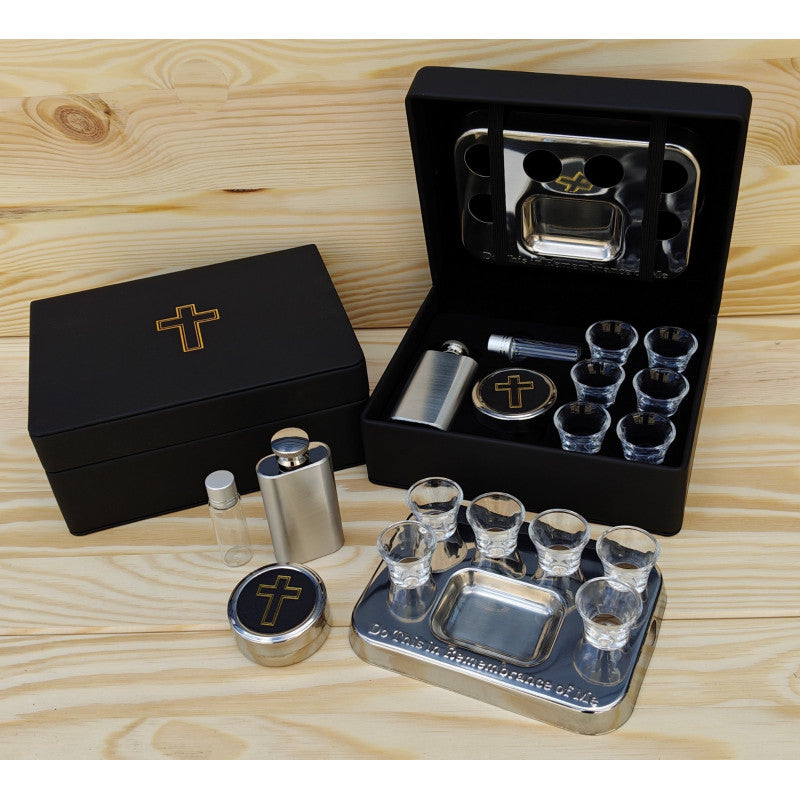 Kompaktes, sehr komplettes und elegantes Set für die Feier des Heiligen Abendmahls im kleinen Kreis zu Hause, für den Krankenbesuch oder unterwegs.