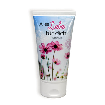 Sanfte Handpflege ohne Parabene und Paraffine, vegan, in 50 ml-Tube. Rundum bedruckt mit Blumenmotiv und Vers "Alles Liebe für dich, Eph 4,32". Dermatologisch getestet, mit hochwertigen Inhaltsstoffen, z.B. Sheabutter und pflegendes Öl aus Oliven.