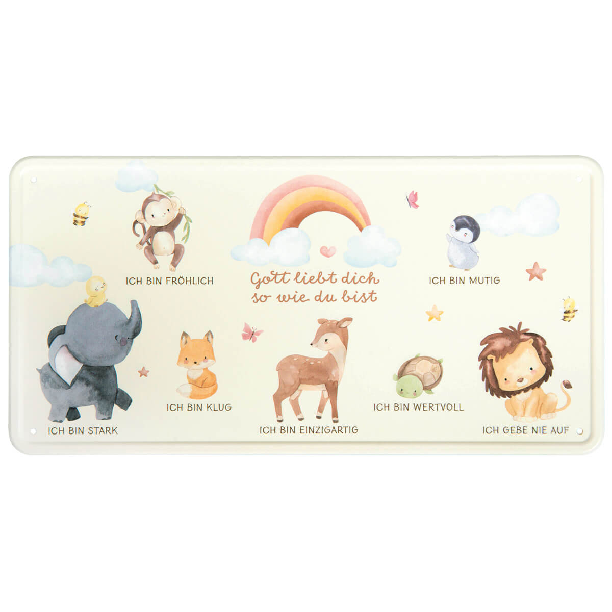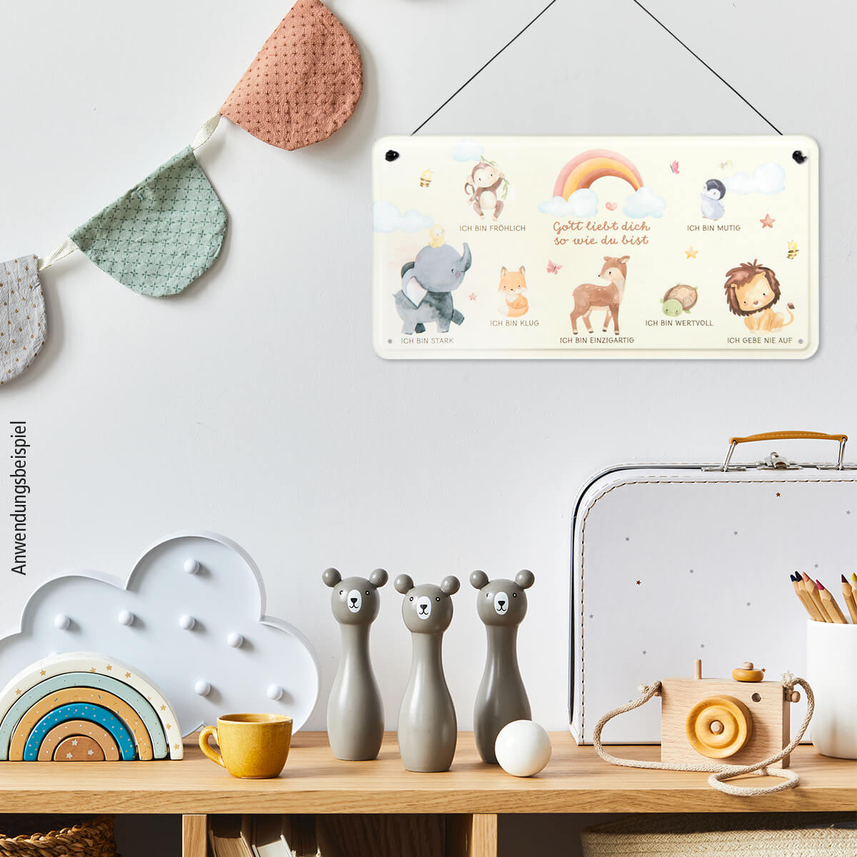Mit mutmachenden Aussagen wie bespielweise "Ich bin einzigartig" und kindgerechten Illustrationen mit Motiven der Arche-Noah-Serie.