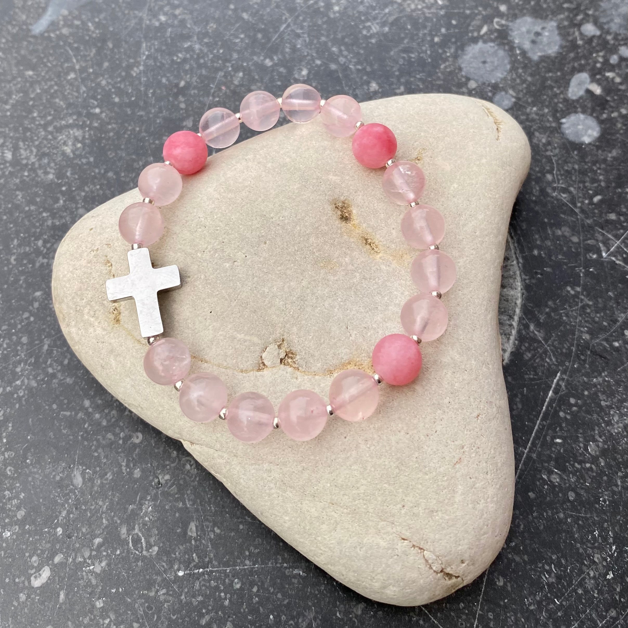 Armband Nina mit silberfarbenem Kreuz (Rosenquarz)