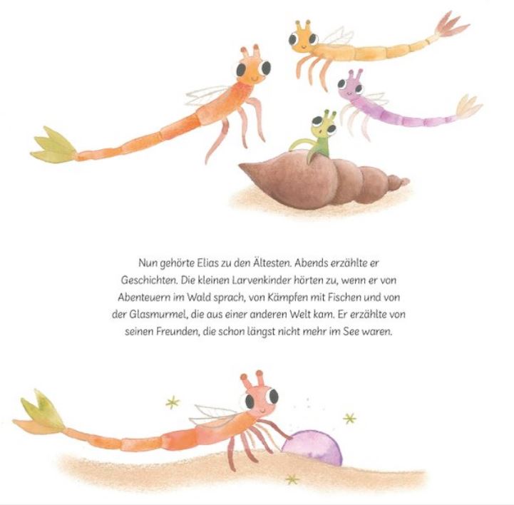 Elias, die Libellenlarve, lebt mit seinen Freunden in einem schönen See. Verwundert beobachtet er, wie die älteren Larven eine nach der anderen verschwinden: Sie durchdringen die Wasseroberfläche und keiner weiß, was dann mit ihnen geschieht. Elias nimmt sich vor, dass er zurückkommen und seinen Freunden davon berichten wird, wenn er das Wasser verlassen muss. Doch dann kommt alles anders