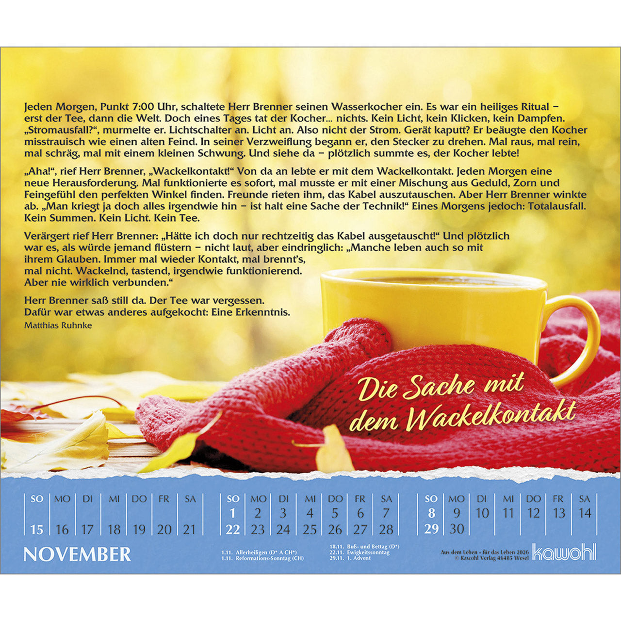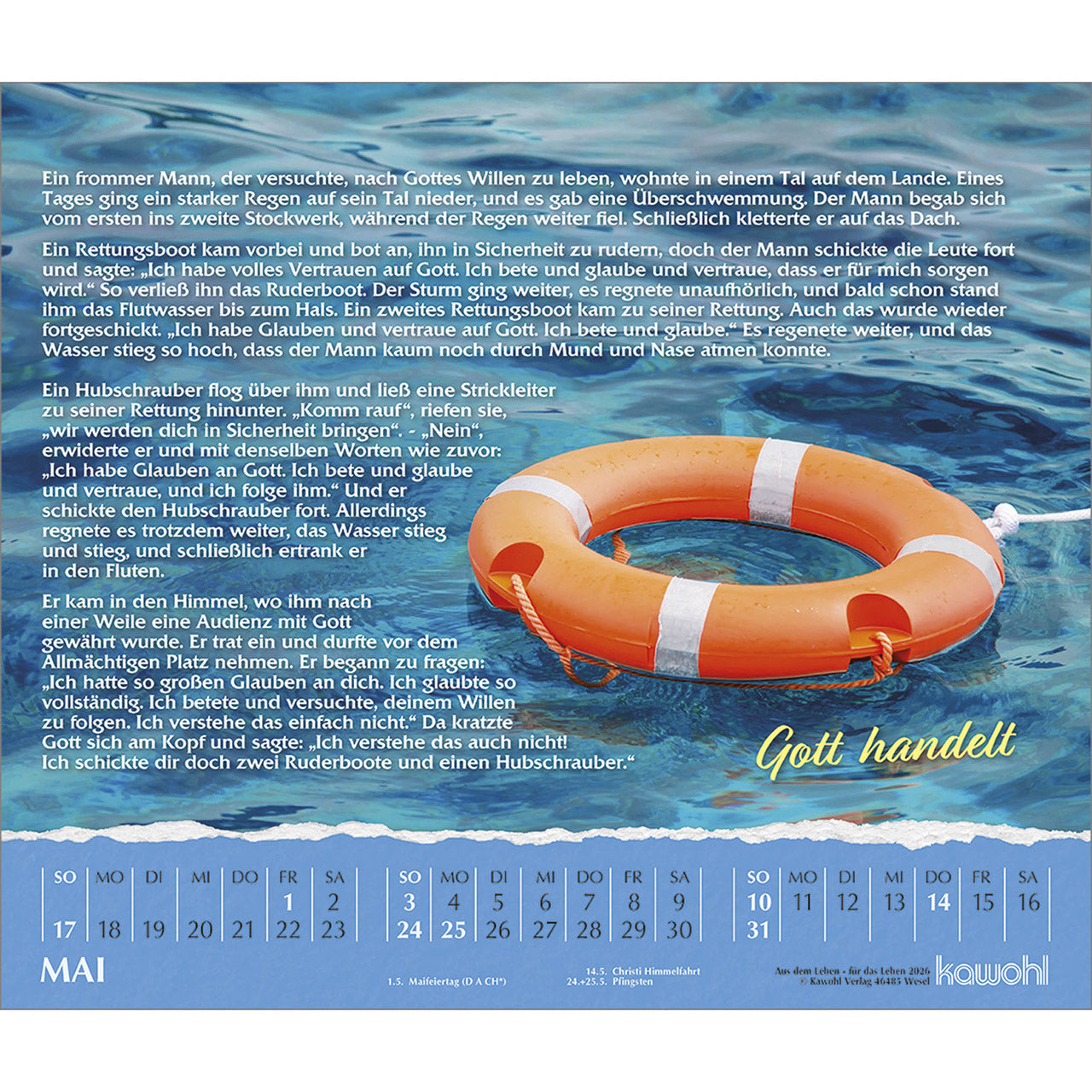 Jedes Kalenderblatt erzählt eine bewegende Kurzgeschichte aus dem Alltag, die uns manches praktisch verständlich macht. Einprägsame Beispielerzählungen sind verbunden mit symbolstarken Bildern. Erfreuendes und Nachdenkliches für Leser und Betrachter aller Altersgruppen.