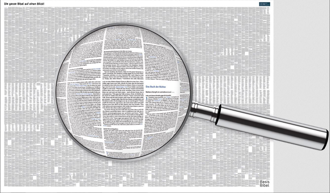 Was auf den ersten Blick wie ein modernes Kunstwerk wirkt, ist beim Betrachten mit der Lupe tatsächlich eine komplette Bibel. Auf dem Poster im Format DIN A0 ist tatsächlich der gesamte Bibeltext in der Übersetzung der BasisBibel enthalten.