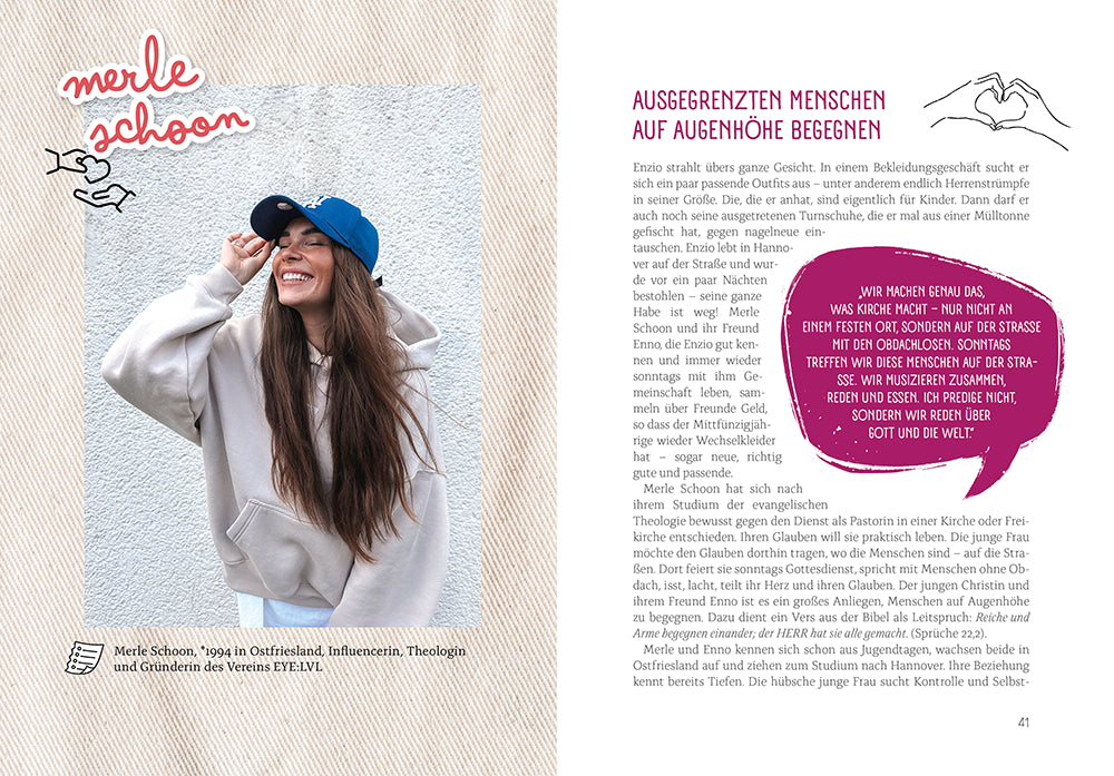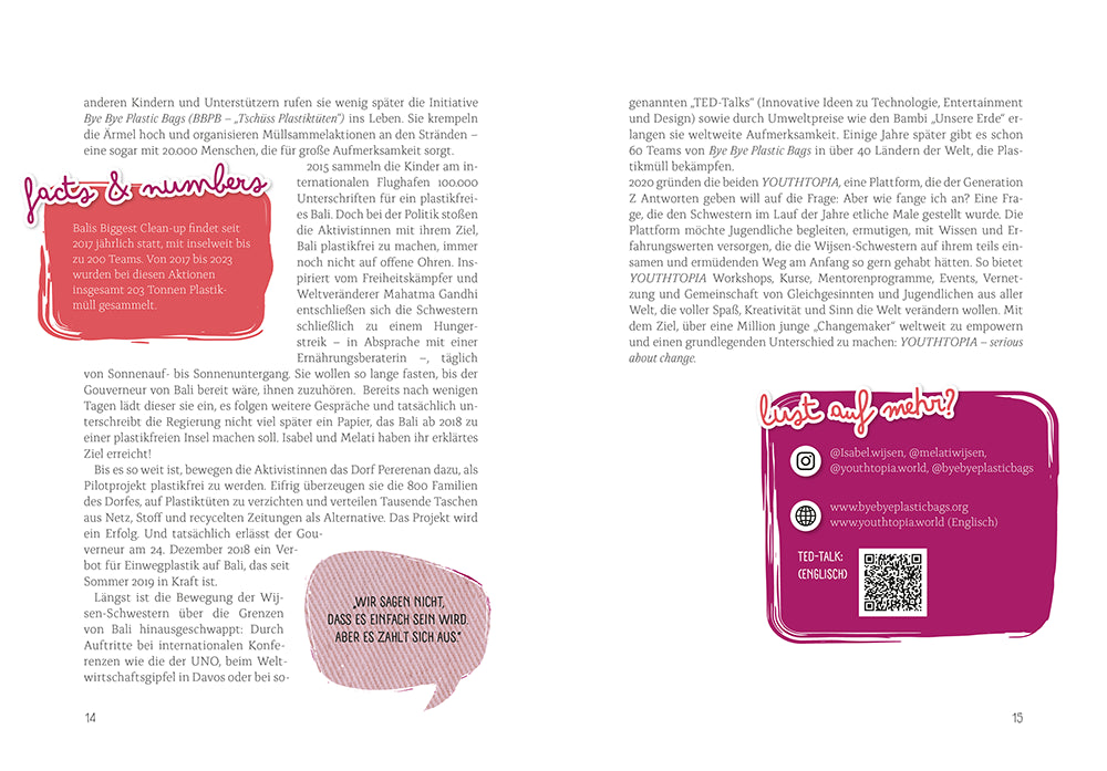 Frauen wie Isabel und Melati Wijsen, die sich in Bali für eine plastikfreie Welt einsetzen, Merle Schoon, die als "Miss Germany" nominiert war und in Deutschland eine Obdachlosenarbeit gegründet hat oder Rahel Lam, die mit ihrem Kunstprojekt "Cup of Color" Hoffnung und Empowerment an dunkle Orte bringt. Auch wichtige Frauen der Geschichte, die bereits in jungen Jahren ihrem Herzen gefolgt sind, finden ihren Platz, wie Astrid Lindgren, Alice Milliat und Sophie Scholl.