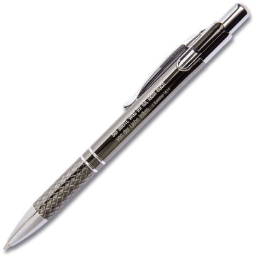 Hochwertiger, titanfarbener Kugelschreiber mit formschönem Metallclip, verzierter Griffzone mit Rillen gegen Abrutschen für ein angenehmes Schreibgefühl.