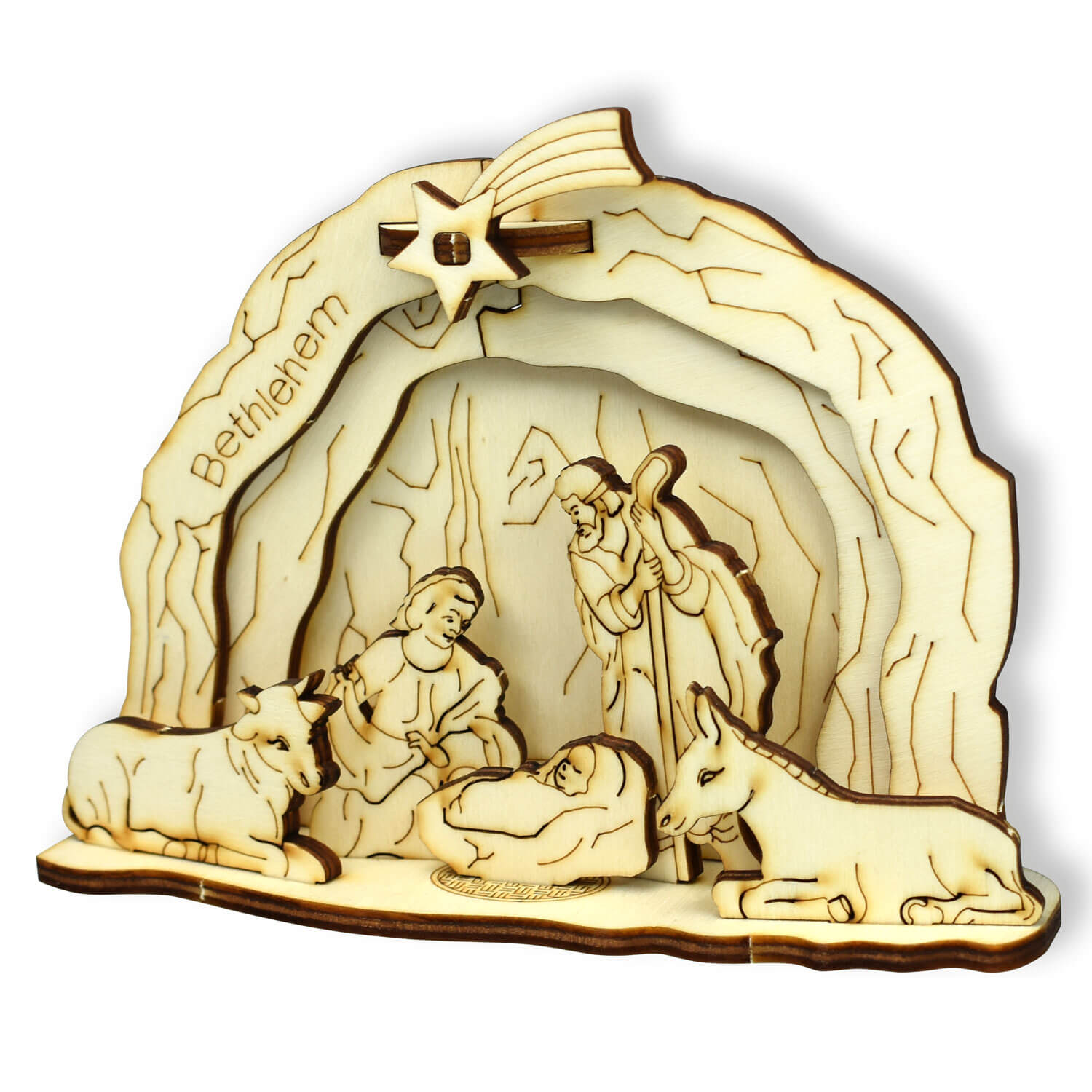 3D-Krippe "Bethlehem" aus Israel zum Zusammenstecken, 15 cm. Gefertigt in Jerusalem, in einem Unternehmen, das dafür eine spezielle Holz-Laserschnitt-Technologie entwickelte. Die Firma legt Wert darauf, beeinträchtigte Menschen im betriebsinternen Arbeitsprozess zu integrieren. Alle Produkte werden umweltfreundlich hergestellt. Auch zum Verschicken geeignet.