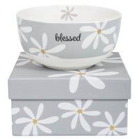 Müslischale "blessed", mit großen weißen Blumen auf hellgrauem Hintergrund. Richtig schönes Geschenk für das morgendliche Müsli, für Snacks oder Suppen.