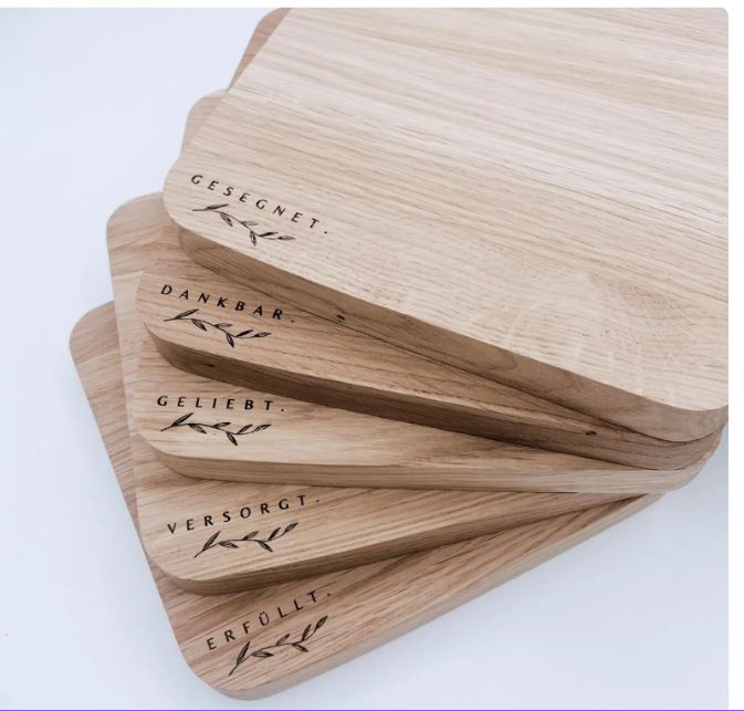 Bei der Abbildung handelt es sich um ein Symolbild. Geliefert wird das Schneidebrett mit dem Text "dankbar".