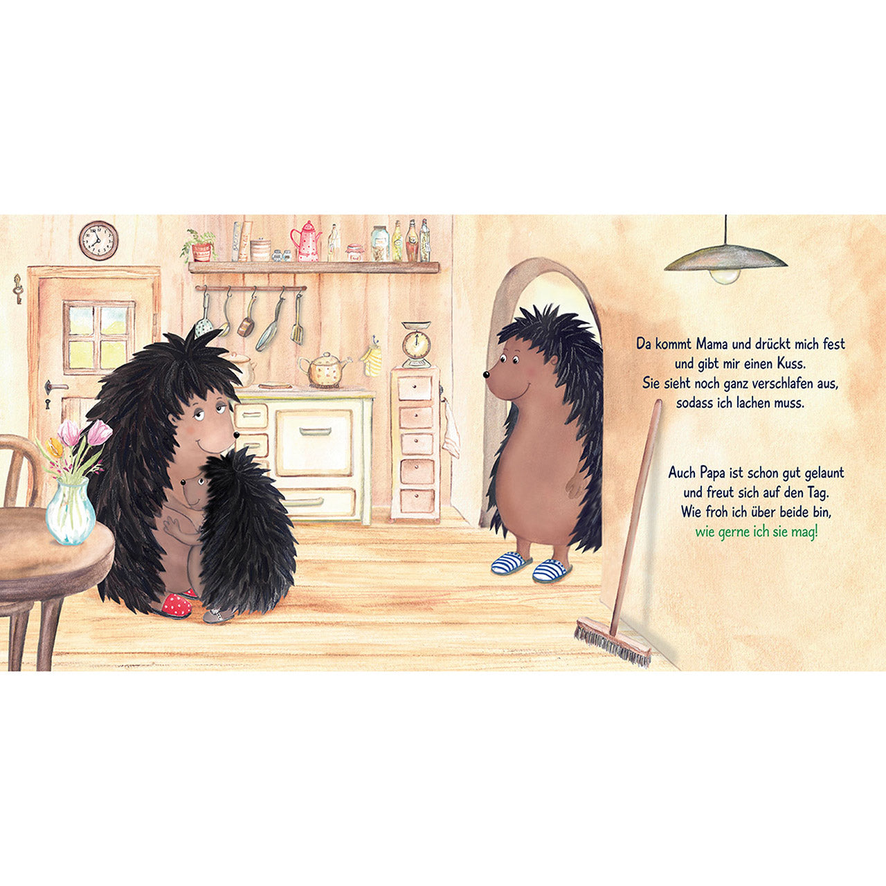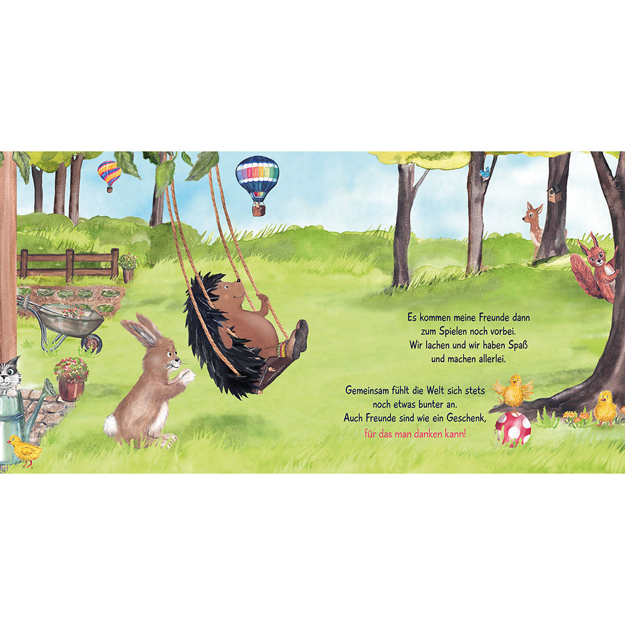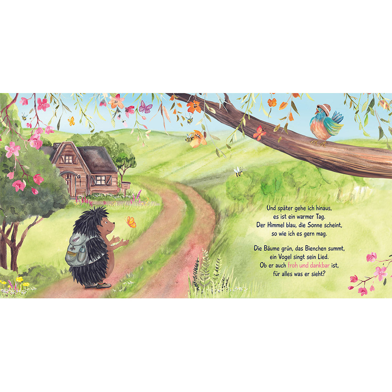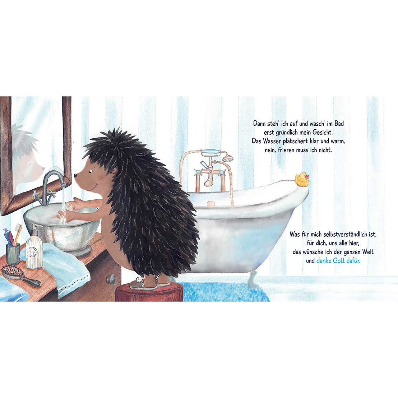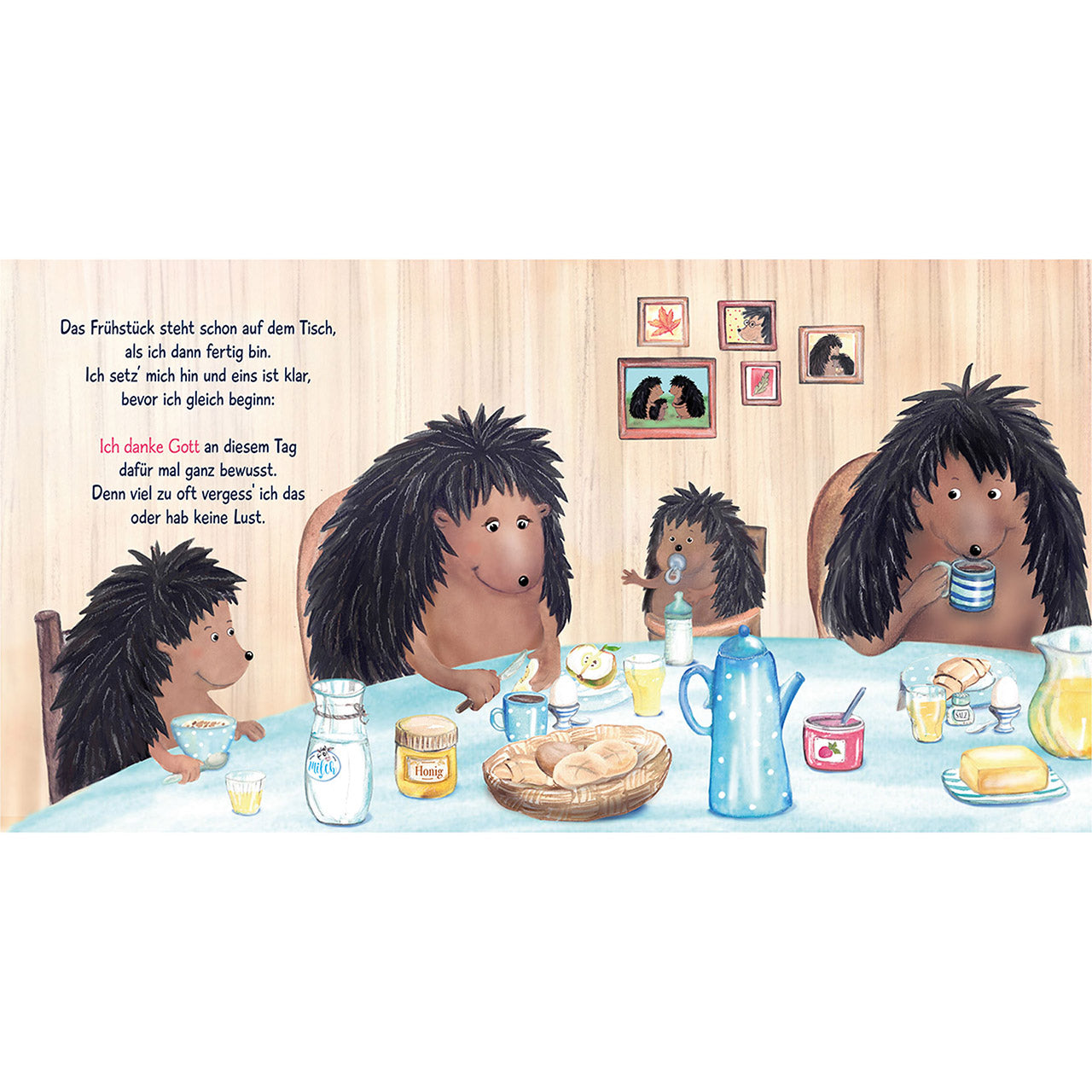 Es gibt sooo viel, wofür wir Gott danken können. Das denkt auch der kleine Igel, den wir einen Tag lang begleiten dürfen. Schon morgens, wenn er aufwacht, freut er sich über sein warmes Bett oder das leckere Frühstück. Und im Laufe des Tages fallen ihm noch viele andere Dinge ein, mit denen Gott ihn beschenkt: seine Igel-Eltern, sein leckeres Mittagessen oder seine Freunde, mit denen er spielen kann. In eingängigen Reimen werden schon die Kleinsten in diesem Pappbilderbuch daran erinnert, dass Gott uns versorgt und wir jeden Tag ganz viel zum Danken finden können. Auf jeder Seite gibt es viel zu entdecken: sei es im gemütlichen Igel-Haus oder im Garten.