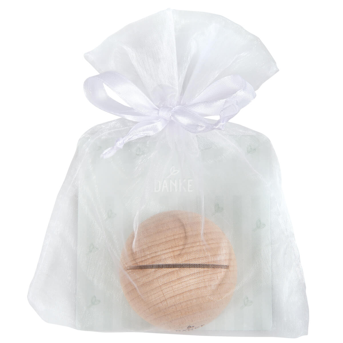 Besonders schön im Organzabeutel verpackt mit passender quadratischer Postkarte, die zudem mit partiellem Lack und abgerundeten Ecken veredelt ist.