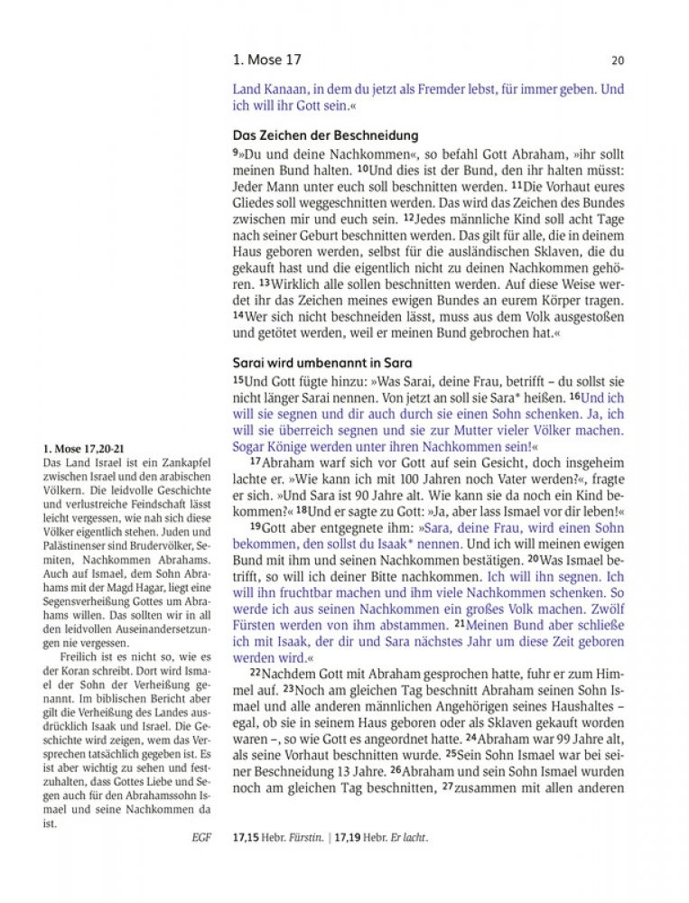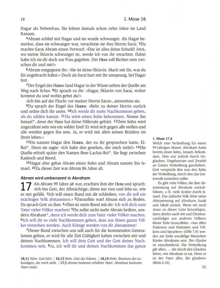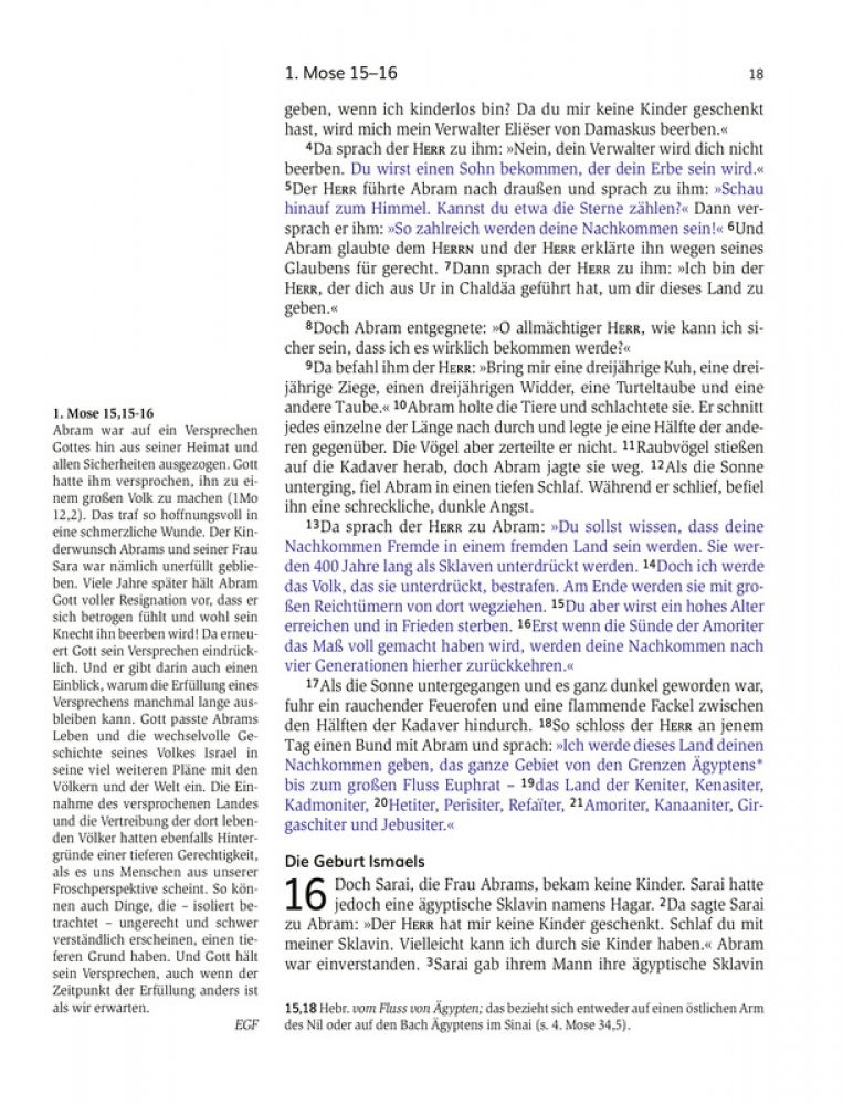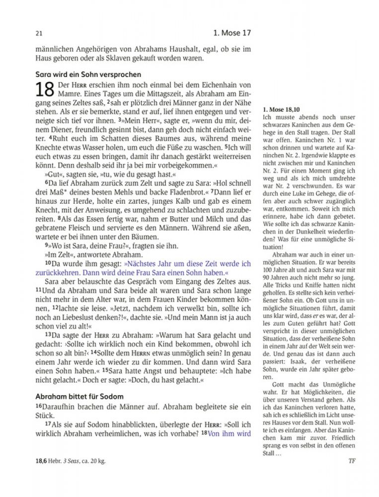 Die Verheißungen der Heiligen Schrift sind im Bibeltext farbig hervorgehoben. Flankiert ist der Bibeltext von breiten Randspalten, die für Anwendungs-Texte zu einzelnen Verheißungen verwendet werden. Der obere, freibleibende Teil der Randspalte kann für persönliche Notizen im Gebet genutzt werden, sodass das Buch auch als biblisch-geistliches Tagebuch genutzt werden kann.