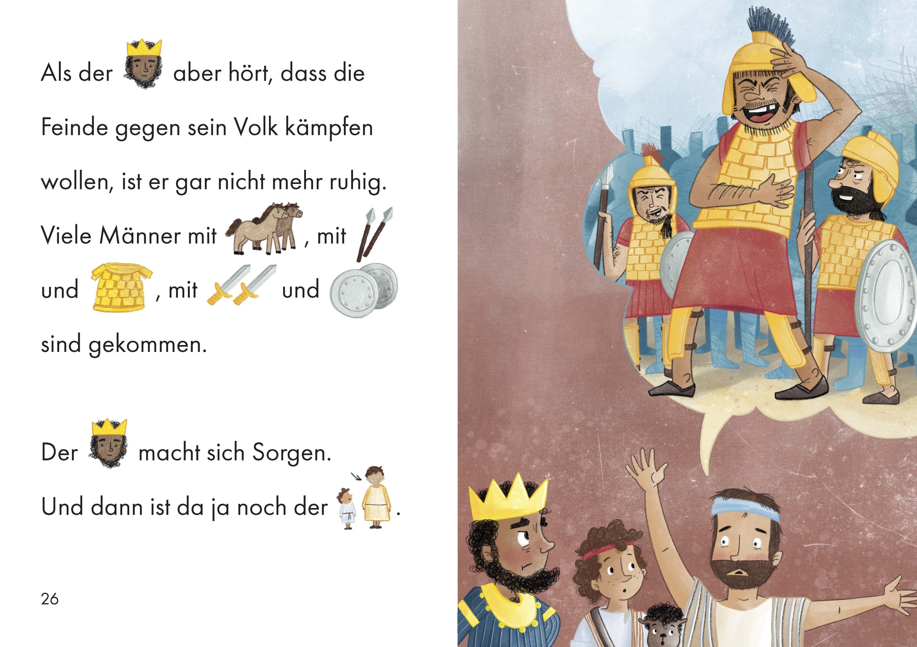 Die biblische Geschichte von David, dem Hirtenjungen, für Erstleser packend erzählt und farbenfroh illustriert.