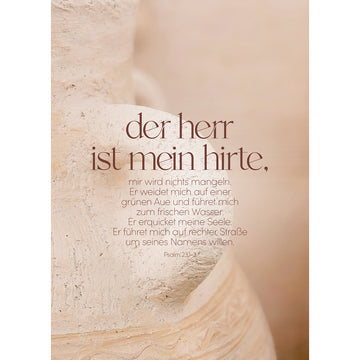 Text: Der Herr ist mein Hirte, mir wird nichts mangeln. Er weidet mich auf einer grünen Aue und führet mich zum frischen Wasser. Er erquicket meine Seele. Er führet mich auf rechter Straße um seines Namens willen.