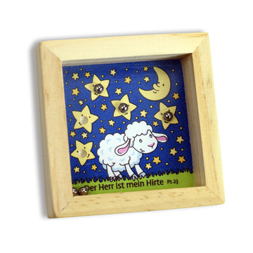 Niedliches Geduldspiel im Holzrahmen mit fünf Stahlkugeln, trainiert Geschicklichkeit, Ausdauer und Koordination. Bedruckt ist das Spiel mit dem Vers "Der Herr ist mein Hirte - Ps 23", 6,5 cm.