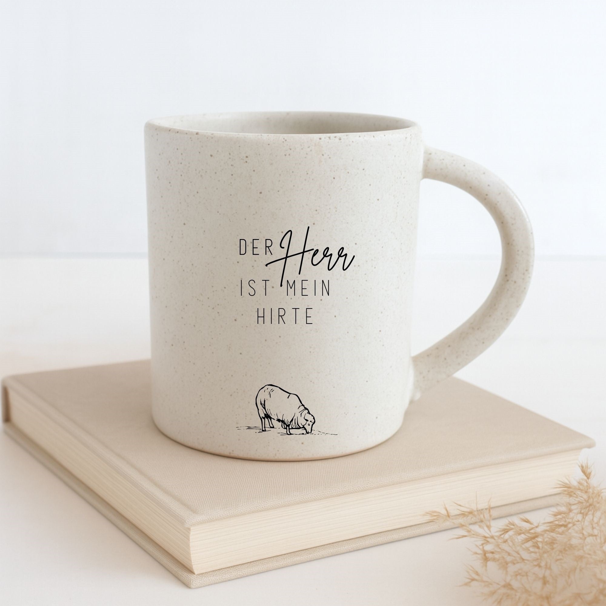 Diese handgefertigte Steingut-Tasse mit ihrer reaktiven Sesamglasur und der Gravur "Der Herr ist mein Hirte" (Psalm 23) ist mehr als ein Alltagsgegenstand - sie ist eine kraftvolle Erinnerung an Gottes Schutz und Führung in deinem Leben.