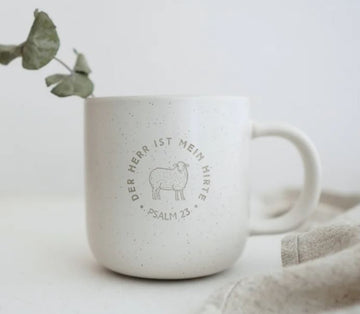 Beginne deinen Tag mit einem Moment der Besinnung und einer Tasse voller Trost! Diese wunderschöne Steinzeug-Tasse ist ein wahres Highlight auf deinem Frühstückstisch. Mit ihrer matten, gesprenkelten Oberfläche und der tiefen Gravur "Der Herr ist mein Hirte" aus Psalm 23 bringt sie eine Botschaft der Hoffnung und Geborgenheit in deinen Alltag.