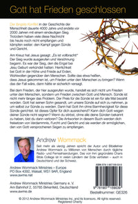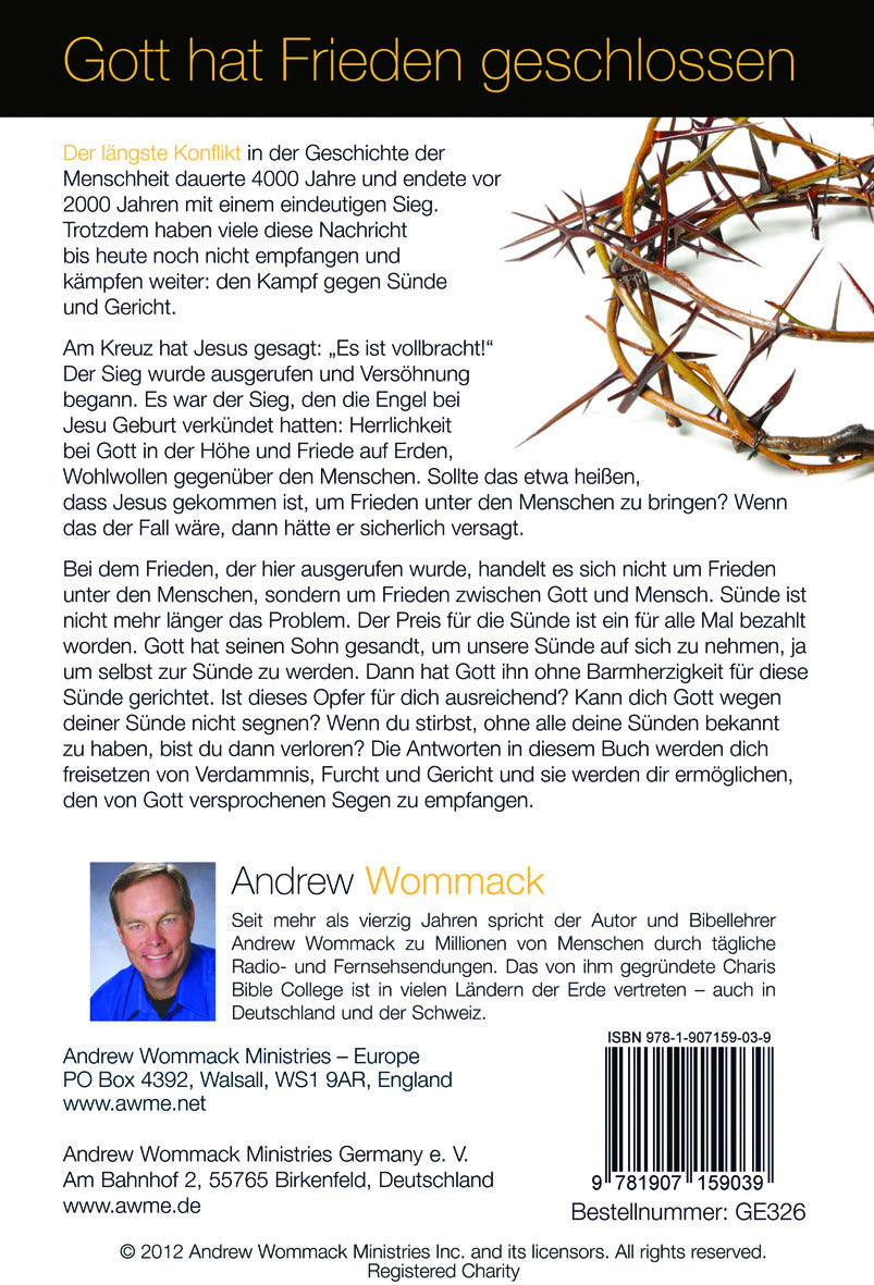 Bei dem Frieden, der hier ausgerufen wurde, handelt es sich nicht um Frieden unter den Menschen, sondern um Frieden zwischen Gott und Mensch. Sünde ist nicht mehr länger das Problem. Der Preis für die Sünde ist ein für alle Mal bezahlt worden. Gott hat seinen Sohn gesandt, um unsere Sünde auf sich zu nehmen, ja um selbst zur Sünde zu werden. Dann hat Gott ihn ohne Barmherzigkeit für diese Sünde gerichtet. Ist dieses Opfer für dich ausreichend? Kann dich Gott wegen deiner Sünde nicht segnen? Wenn du stirbst, ohne alle deine Sünden bekannt zu haben, bist du dann verloren? Die Antworten in diesem Buch werden dich freisetzen von Verdammnis, Furcht und Gericht und sie werden dir ermöglichen, den von Gott versprochenen Segen zu empfangen.