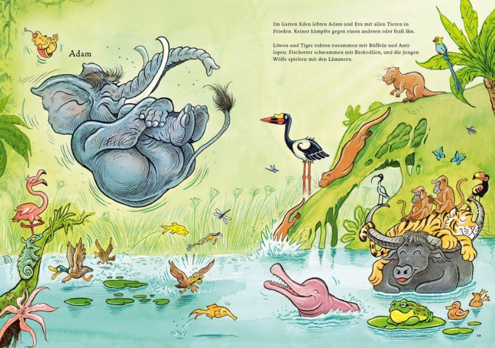 Adam und Eva sind ein Elefantenpaar: Schließlich sind Elefanten großartige Gärtner für den Paradiesgarten.