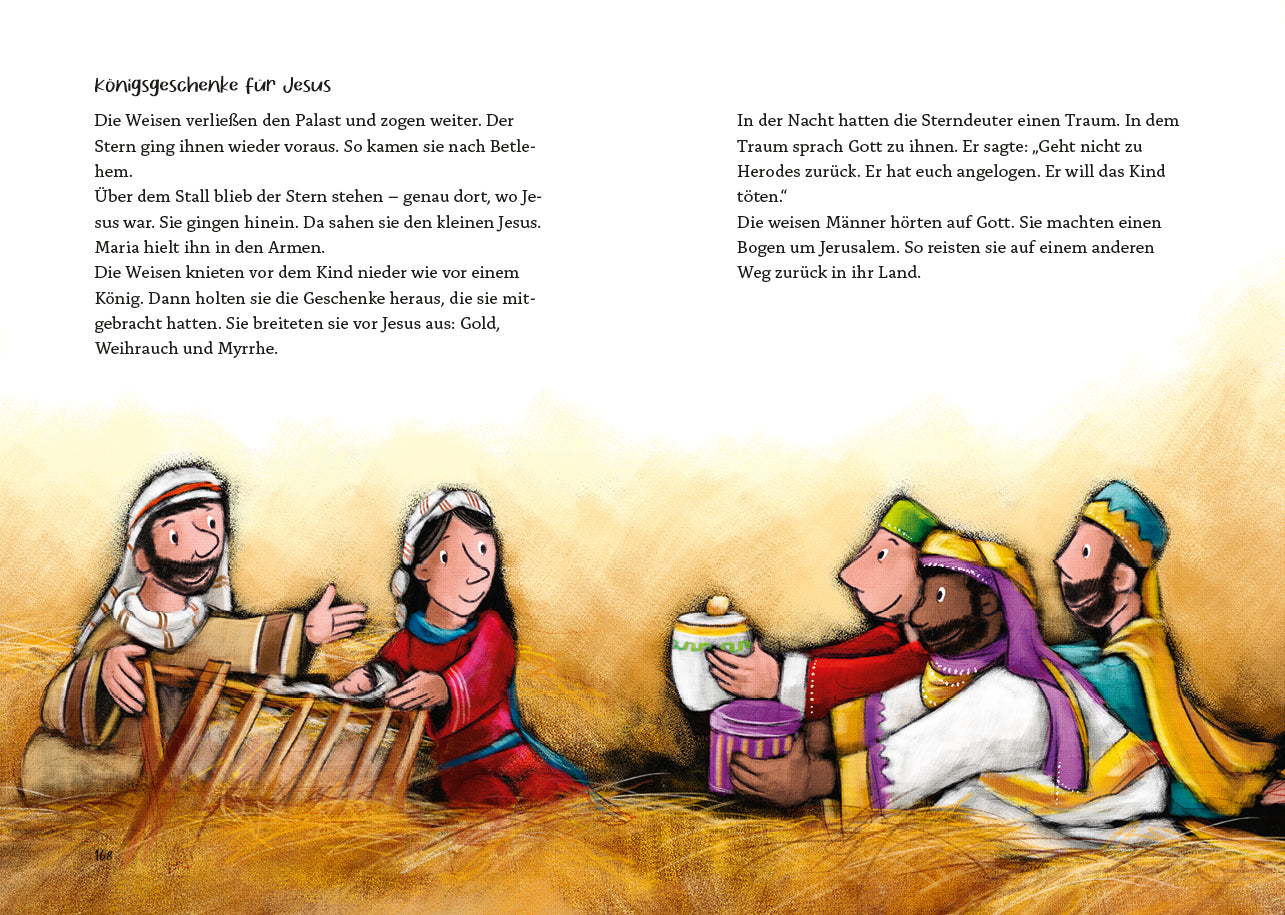 Die Weihnachtsgeschichte, Jesus macht Menschen gesund, Mit Jesus auf dem See, Der verlorene Sohn, Die Ostergeschichte, Himmelfahrt und Pfingsten, Saulus wird Christ, Johannes sieht große Geheimnisse Diese Bibel eignet sich zum Vorlesen auch für jüngere Kinder, besonders aber für Schulkinder, die bereits selber lesen können, und ist wie geschaffen für den Einstieg in ein selbstständiges Leseleben!