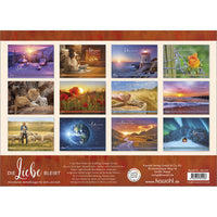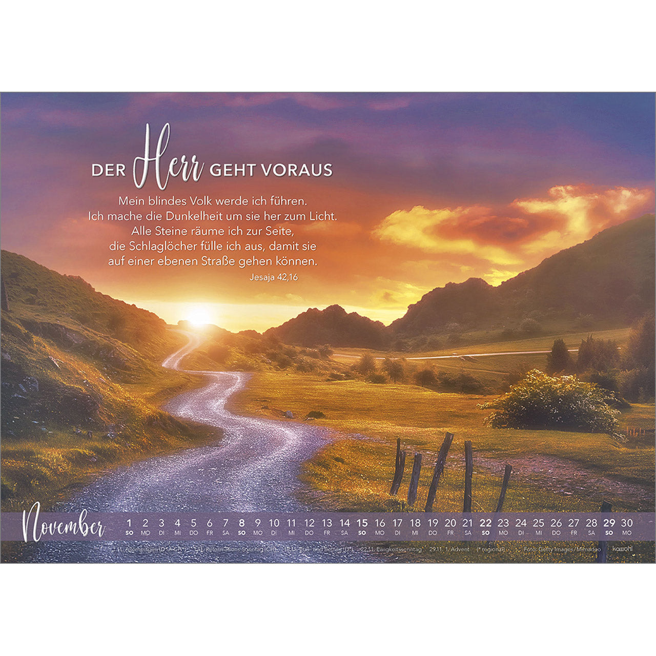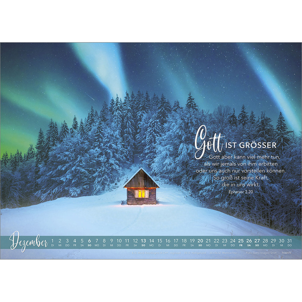 In der Bibel finden wir unzählige Zusagen Gottes, die uns ermutigen, herausfordern, stärken und trösten können. Dieser inspirierende Wandkalender kombiniert prägnante Verheißungen Gottes mit brillanten Bildern. Er ist eine stilvolle Einladung, Gottes Liebe mit dem Herzen zu sehen und seine Zusagen vertrauensvoll und dankbar im Blick zu behalten.