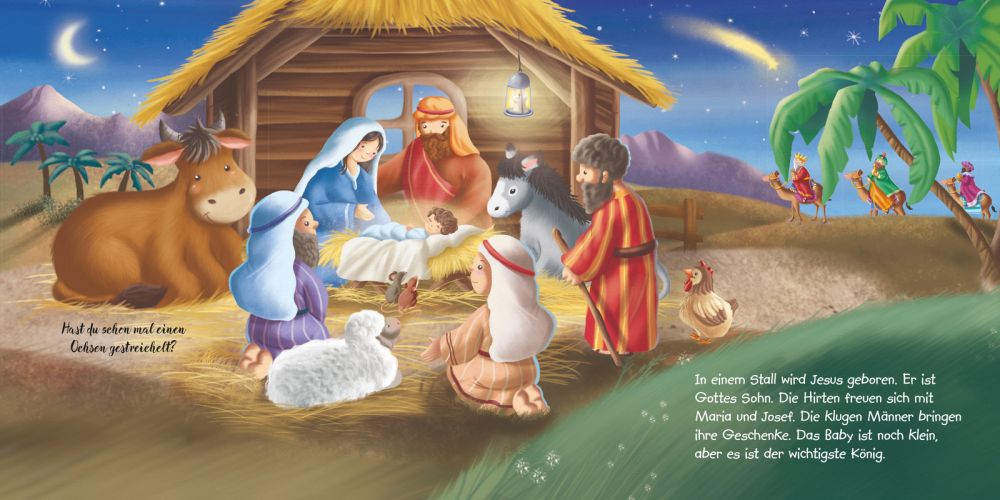In dieser Weihnachtsgeschichte können Kinder fühlen, wie flauschig das Fell des Schäfchens ist, das mit den Hirten zur Krippe geht! Und der Weg, auf dem die drei Weisen reiten, ist ganz rau. - Wenn Kinder das Weihnachtsgeschehen auf fühlende Weise begreifen können, wird die Geschichte von der Geburt Jesu ganz lebendig. Sie begleiten Maria und Josef, die Hirten und die Weisen. Am Ende wird klar: An Weihnachten feiern wir, dass Jesus geboren wurde, weil Gott uns liebt.