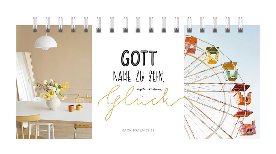 Dieses neue Aufstellbuch verbindet 26 handgeschriebene Bibelverse im beliebten Handlettering-Stil aus den Himmelsglück-Kalendern mit einer frischen Auswahl aus trendigen Bildmotiven. Durch die Dreiteilung sind die Motive frei kombinierbar und es entstehen immer wieder neue, wunderschöne Seiten.