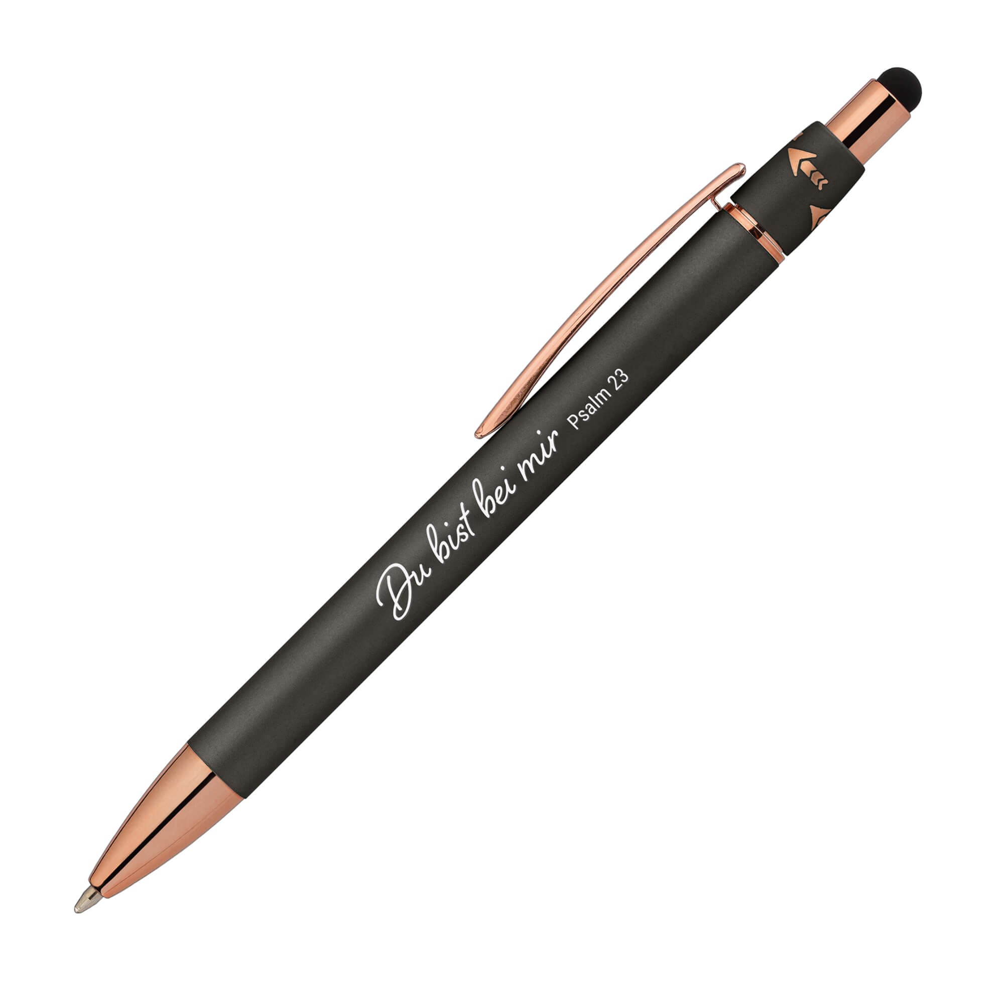 Der Kuli zeichnet sich durch seine pfiffige Drehfunktion aus, verziert mit roségoldfarbenen Pfeilen. Die in gleicher Farbe gehaltenen Verzierungen und die luxuriöse Gummibeschichtung verleihen dem Kuli einen eleganten Touch.
