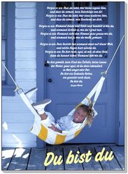 Du bist du - Vergiss es nie: Dass du lebst, war keine eigene Idee, und dass du atmest, kein Entschluss von dir. Vergiss es nie: Dass du lebst, war eines anderen Idee, und dass du atmest, sein Geschenk an dich. Vergiss es nie: Niemand denkt und fühlt und handelt so wie du, und niemand lächelt so, wie dus grad tust. Vergiss es nie: Niemand sieht den Himmel ganz genau wie du, und niemand hat je, was du weißt, gewusst. Vergiss es nie: Dein Gesicht hat niemand sonst auf dieser Welt, und solche Augen hast alleine du. Vergiss es nie: Du bist reich, egal, ob mit, ob ohne Geld, denn du kannst leben! Niemand lebt wie du. Du bist gewollt, kein Kind des Zufalls, keine Laune der Natur, ganz egal, ob du dein Lebenslied in Moll singst oder Dur. Du bist ein Gedanke Gottes, ein genialer noch dazu. Du bist du. Jürgen Werth