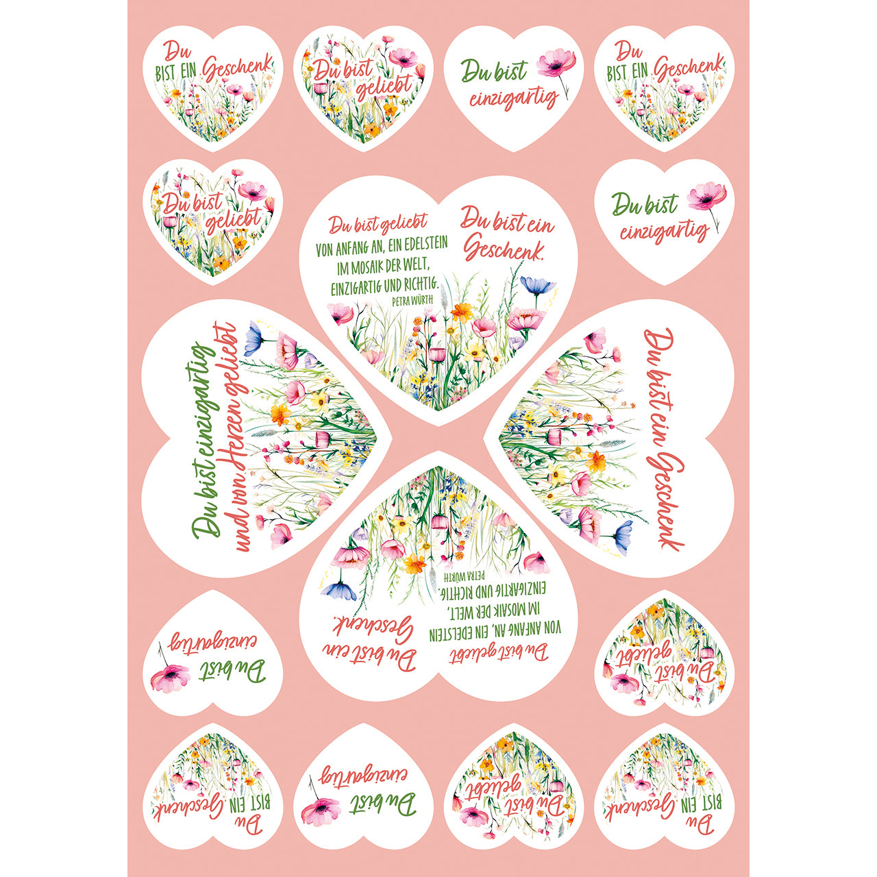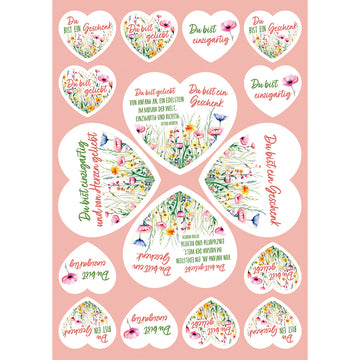Texte auf kleinen Herz-Aufklebern (je 3 Aufkleber):