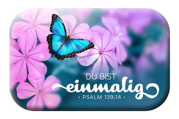 Der Magnet ist zusammen mit einem Minikärtchen in einer Folie verpackt. Auf der Vorderseite des Kärtchens ist das Motiv des Magneten zu sehen, auf der Rückseite befindet sich ein passendes Bibelzitat.