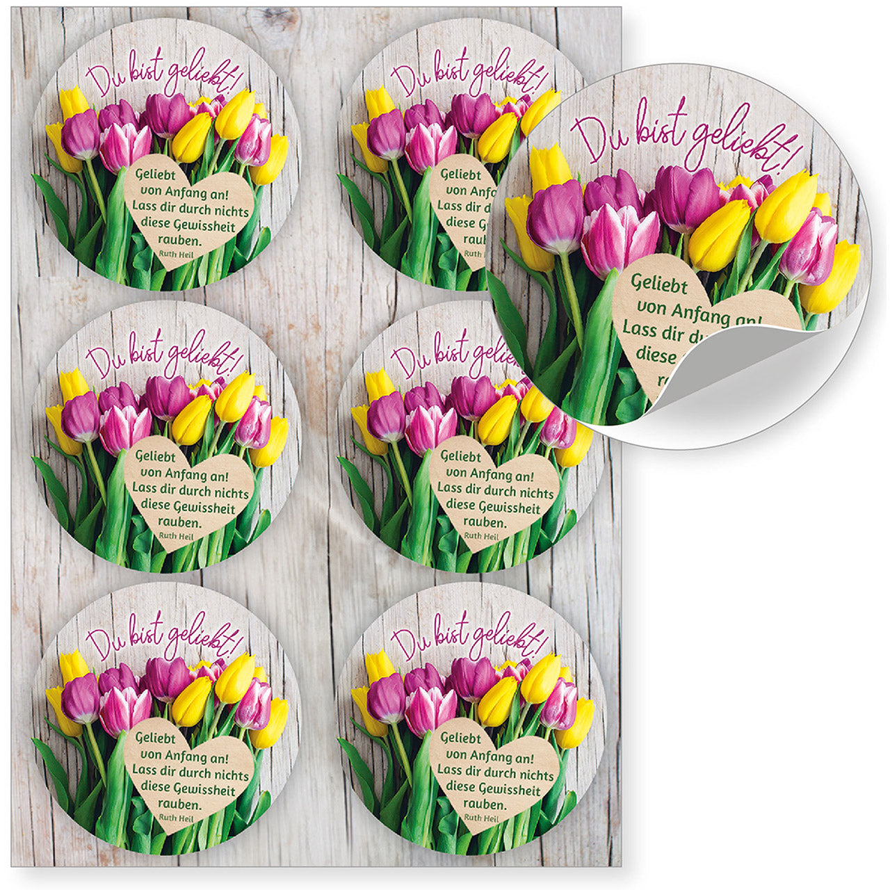 - auf jeder Grußkarte befinden sich 6 runde Sticker (Durchmesser je Sticker: ca. 45 mm)
