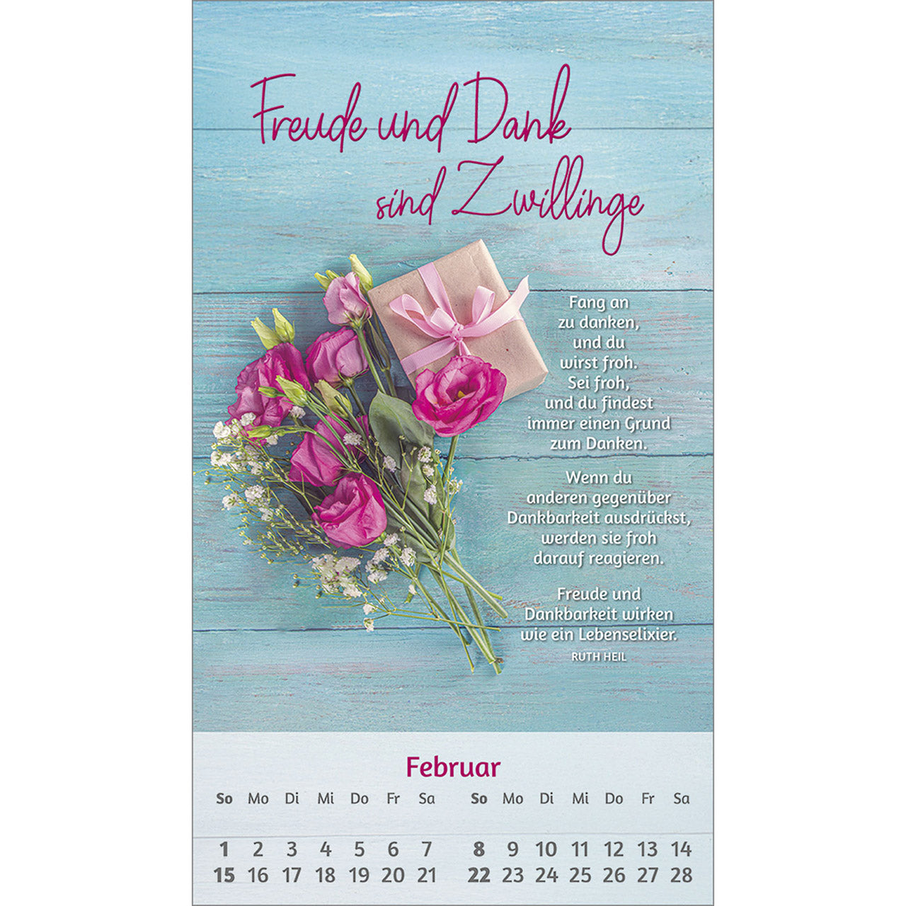 Warmherzige Zusprüche und lebensnahe Impulse möchten Sie durch das Jahr begleiten. Mit den harmonisch abgestimmten Fotomotiven sorgen sie für einen tollen Blickfang.