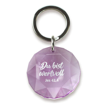 Schlüsselanhänger "Diamant", bedruckt mit "Du bist wertvoll. Jes 43,4", lila, transparentes Acryl, 4 cm, mit flachem Chrom-Metallring, edel in schwarzem Organzabeutel verpackt