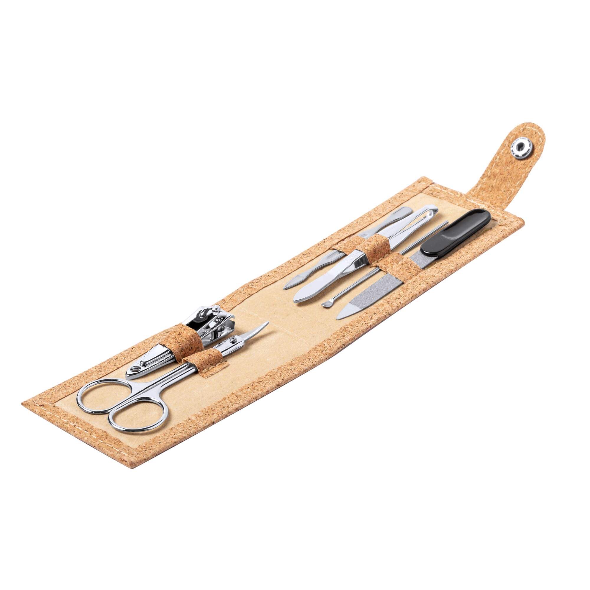 6-teiliges Maniküre-Set bestehend aus Schere, Nagelknipser, Feile, Pinzette, Nagelhautschieber und Nagelreiniger aus Edelstahl. Übersichtlich aufbewahrt in einem Naturkork-Etui mit Druckknopf.