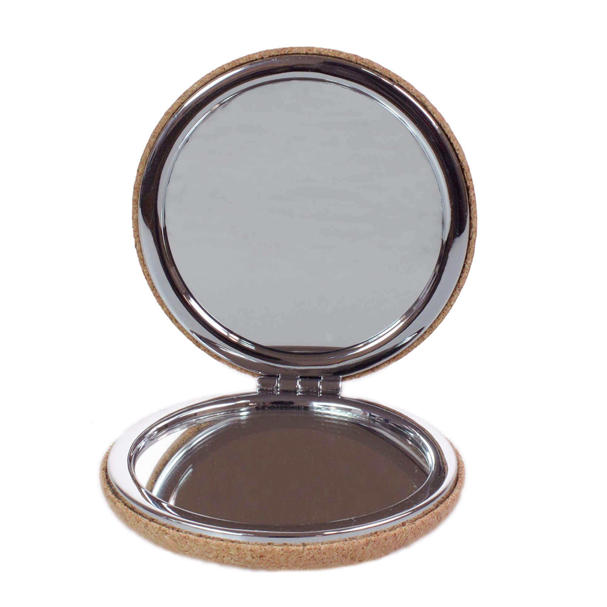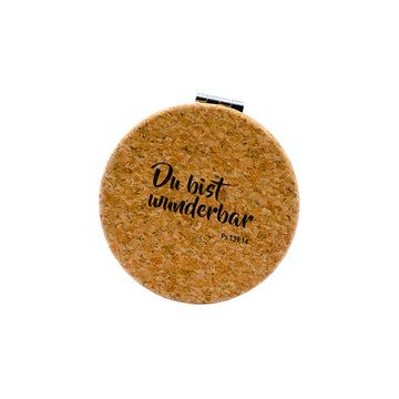 Hochwertiger Doppelspiegel aus Metall mit Korkummantelung und bedrucktem Deckel, Vers "Du bist wunderbar Ps 139,14".
