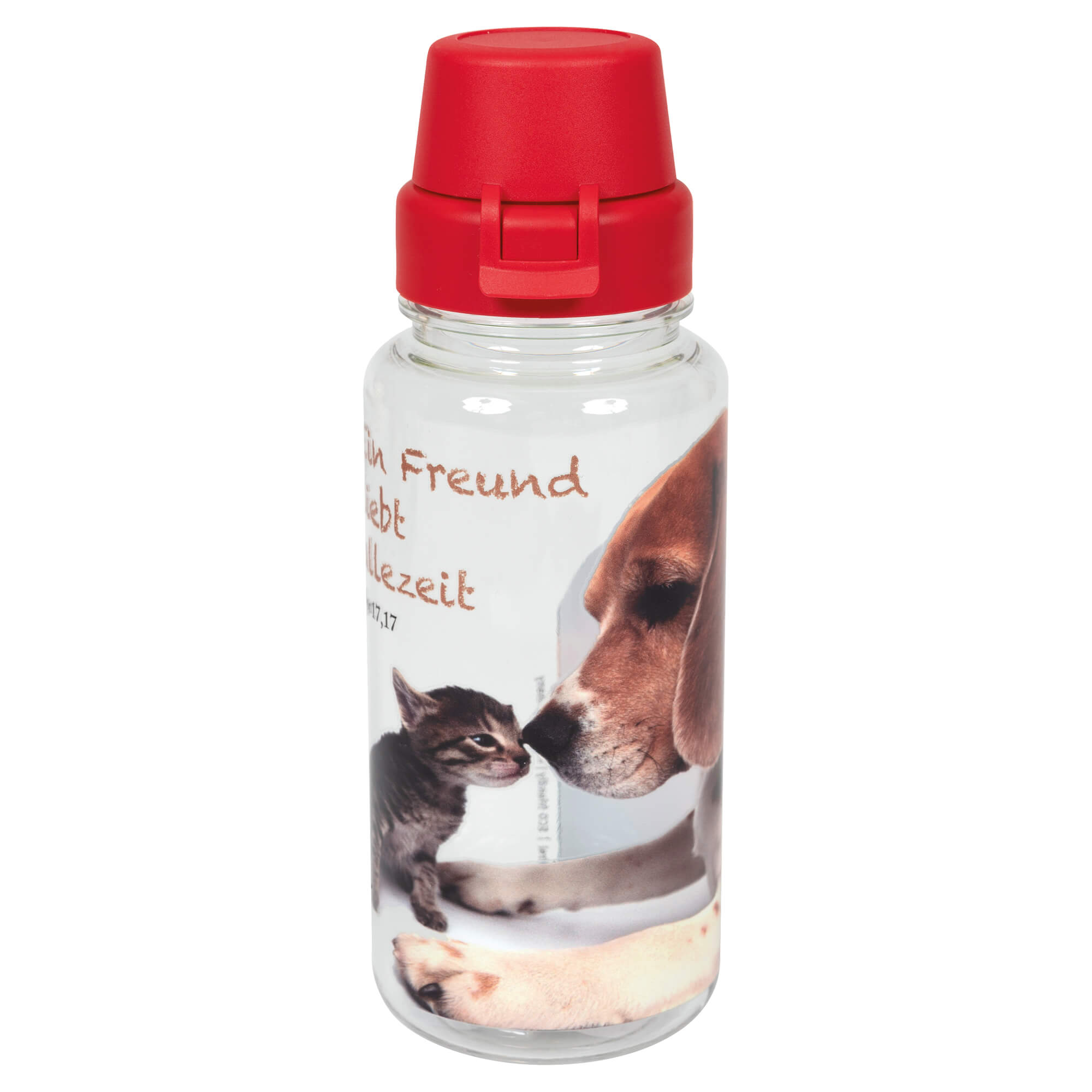Mit niedlichem Motiv "Ein Freund liebt allezeit Spr 17,17": Trinkflasche aus 100% recyclebarem, geschmacks- und geruchsneutralem Tritan/Kunststoff; widerstandsfähiges, bruchfestes und robustes Material; einfaches Reinigen und Befüllen durch große Öffnung, auslaufsicher, für kohlensäurehaltige Getränke geeignet, frei von Weichmachern und BPA, HACCP-zertifiziert als Nachweis für gute Herstellung, CO2-neutrale Produktion, mit Digitaldruck, spülmaschinengeeignet.