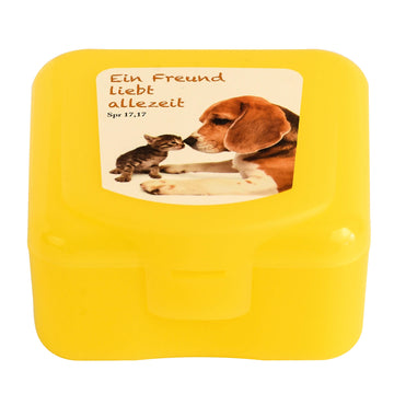 Die handlichen Boxen mit dem beliebten Hunde- und Katzen-Motiv und dem Aufdruck "Ein Freund liebt allezeit Spr 17,17" sind zu 100% lebensmittelecht, geruchsneutral, spülmaschinen- und mikrowellengeeignet bis 120 Grad, recycelbar und frei von Weichmachern.