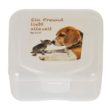 Die handlichen Boxen mit dem beliebten Hunde- und Katzen-Motiv und dem Aufdruck "Ein Freund liebt allezeit Spr 17,17" sind zu 100% lebensmittelecht, geruchsneutral, spülmaschinen- und mikrowellengeeignet bis 120 Grad, recycelbar und frei von Weichmachern.