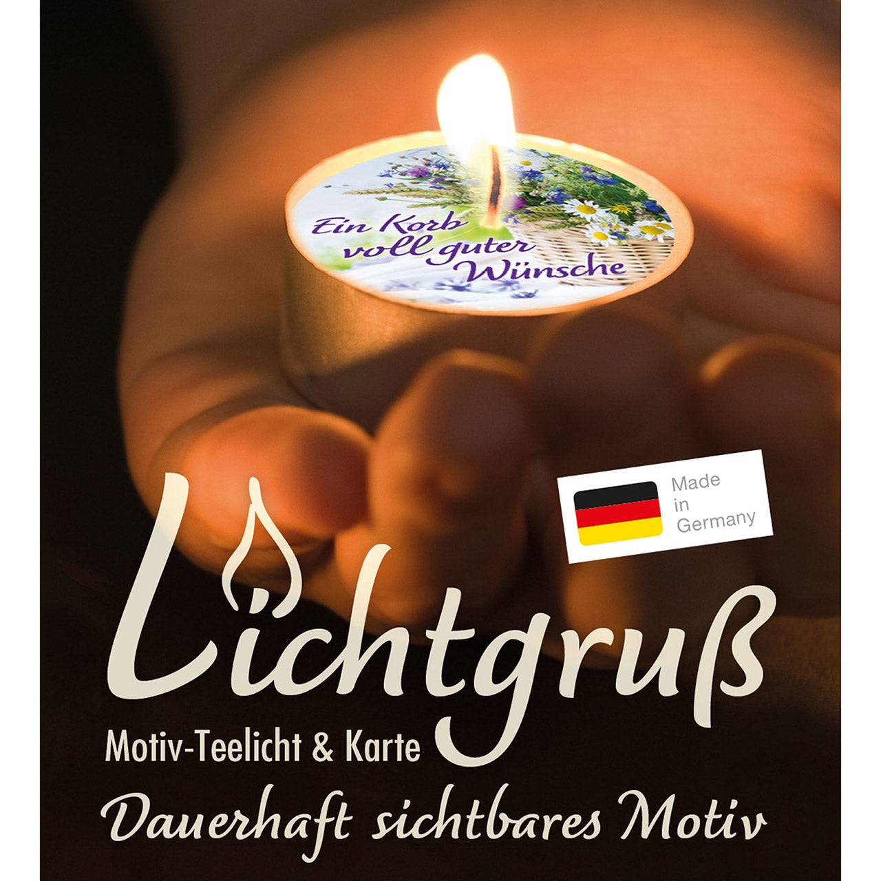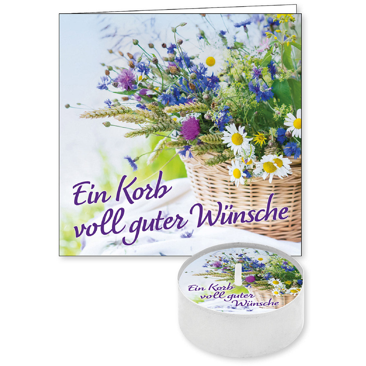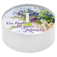 Text auf dem Teelicht: Ein Korb voll guter Wünsche