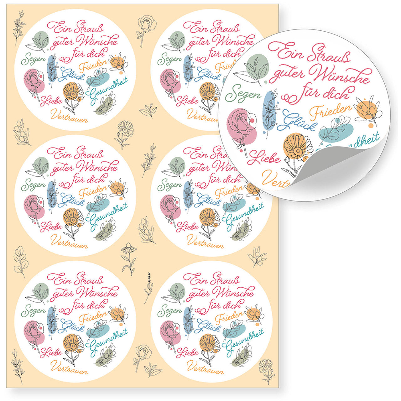 - auf jeder Grußkarte befinden sich 6 runde Sticker (Durchmesser je Sticker: ca. 45 mm)