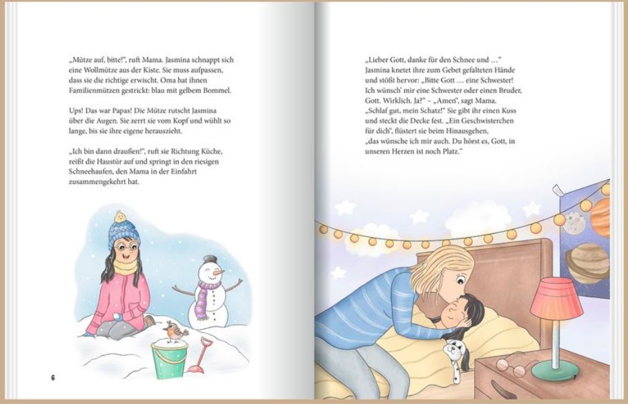 Theo wiederum hat viel Angst und Wut im Bauch. Doch das gemeinsame Spielen macht ihm und Jasmina Spaß. Auch Fahrradfahren lernt Theo mit seinem Pflegevater. Immer mehr integriert er sich in seine neue Familie und auch seine Bauchmama kommt zu Besuch. Als es Winter wird, wühlt Theo in der Mützenkiste. Jasmina ist gespannt: Wird er doch die Familienmütze tragen? Für Jasmina, Mama und Papa ist er so oder so ein Geschenk Gottes.