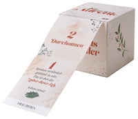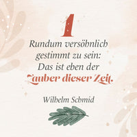 Ein kleiner Adventsmoment für jeden Tag. Einfach ein Kärtchen aus der Box ziehen und abtrennen. Auf jedem der hübsch gestalteten Kärtchen befindet sich ein weihnachtlicher Gedanken oder eine kleine Idee, die ein Stück Advent in die trubelige Vorweihnachtszeit bringt.