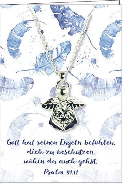 Schöne Schmuckkette mit Engel-Anhänger auf einer hübsch gestalteten Faltkarte mit Bibelwort.