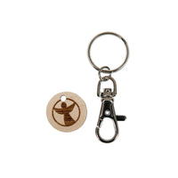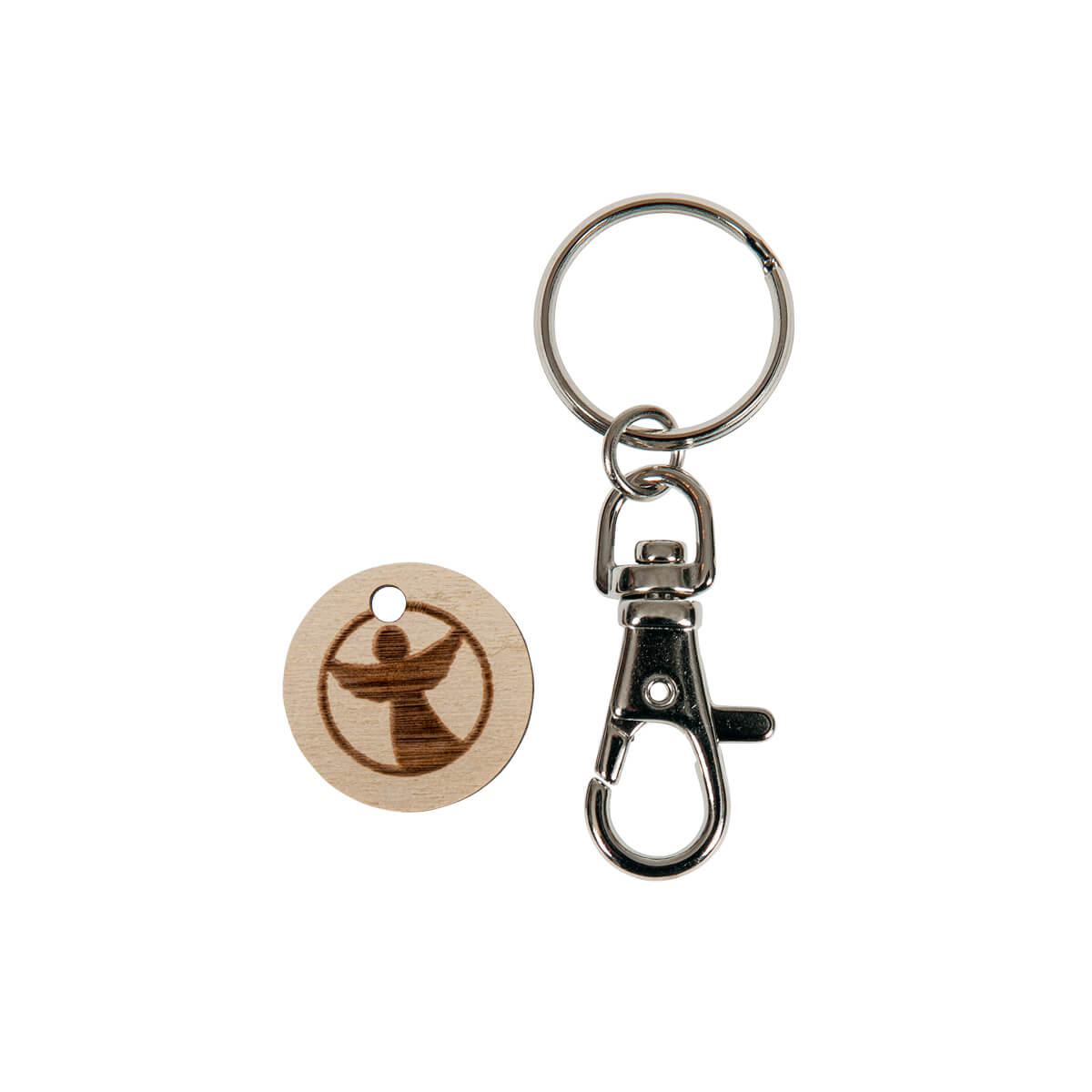 Schlüsselanhänger mit praktischem Karabinerhaken zum überall einhängen. Der Einkaufswagenchip aus Birkenholz ist mit einem Engel gelasert.