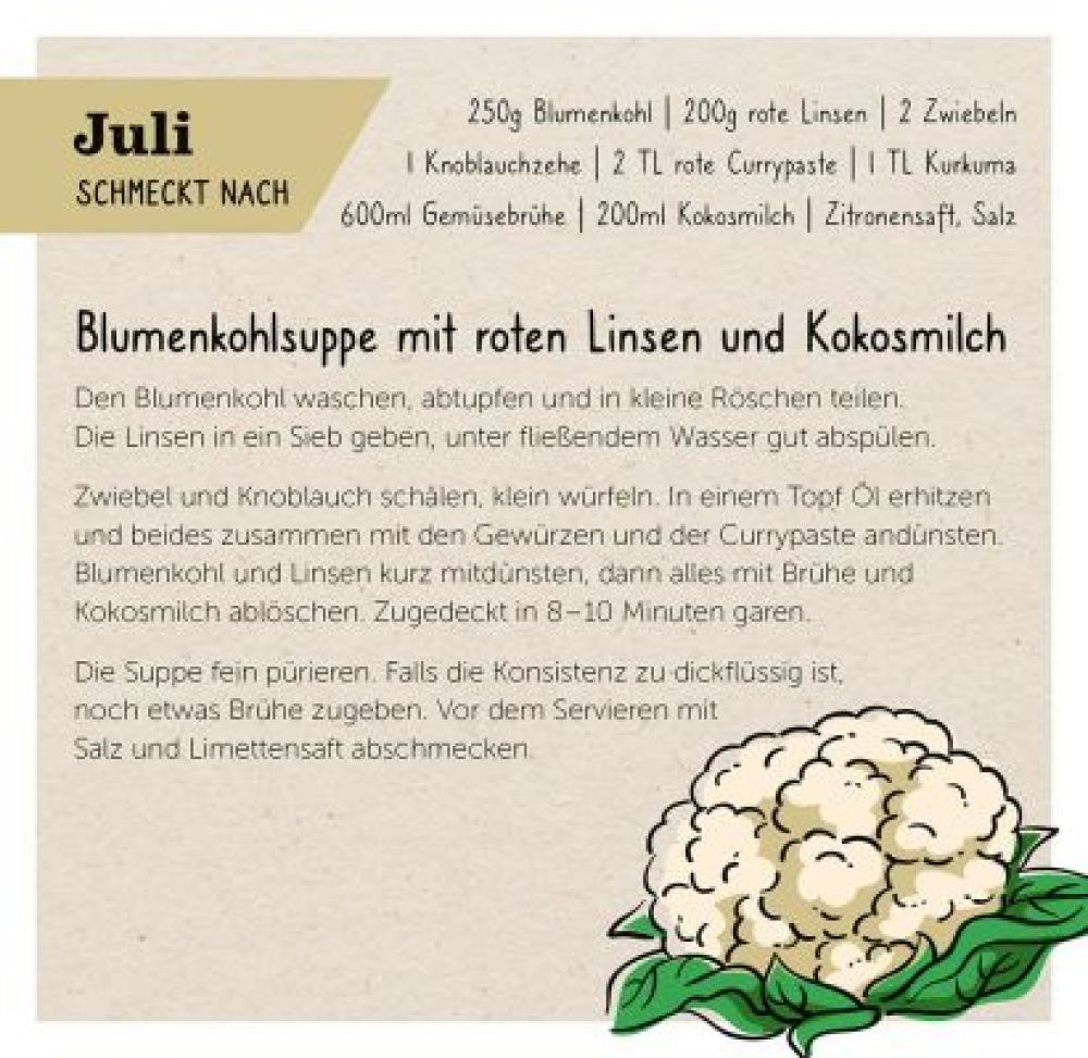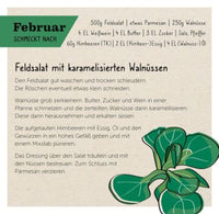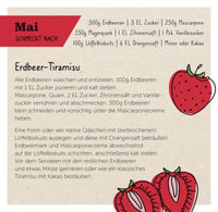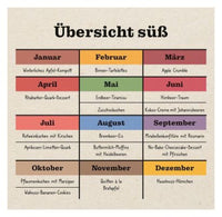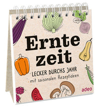 Rund ums Jahr hält der hochwertige Aufsteller zahlreiche neue Ideen für abwechslungsreiche Gerichte bereit. Auf den farbenfroh gestalteten Vorderseiten finden sich jede Menge herzhafte Rezepte. Die Hauptrolle bei den vegetarischen Rezeptideen spielen Gemüsesorten der Saison. Dreht man den Aufsteller herum, warten zahlreiche Süßspeisen darauf, entdeckt zu werden. Natürlich steht dabei leckeres Obst im Mittelpunkt, das im jeweiligen Monat frisch geerntet werden möchte. Zwischendurch machen kurze Zitate und Bibelverse Lust aufs Kochen und Genießen.
