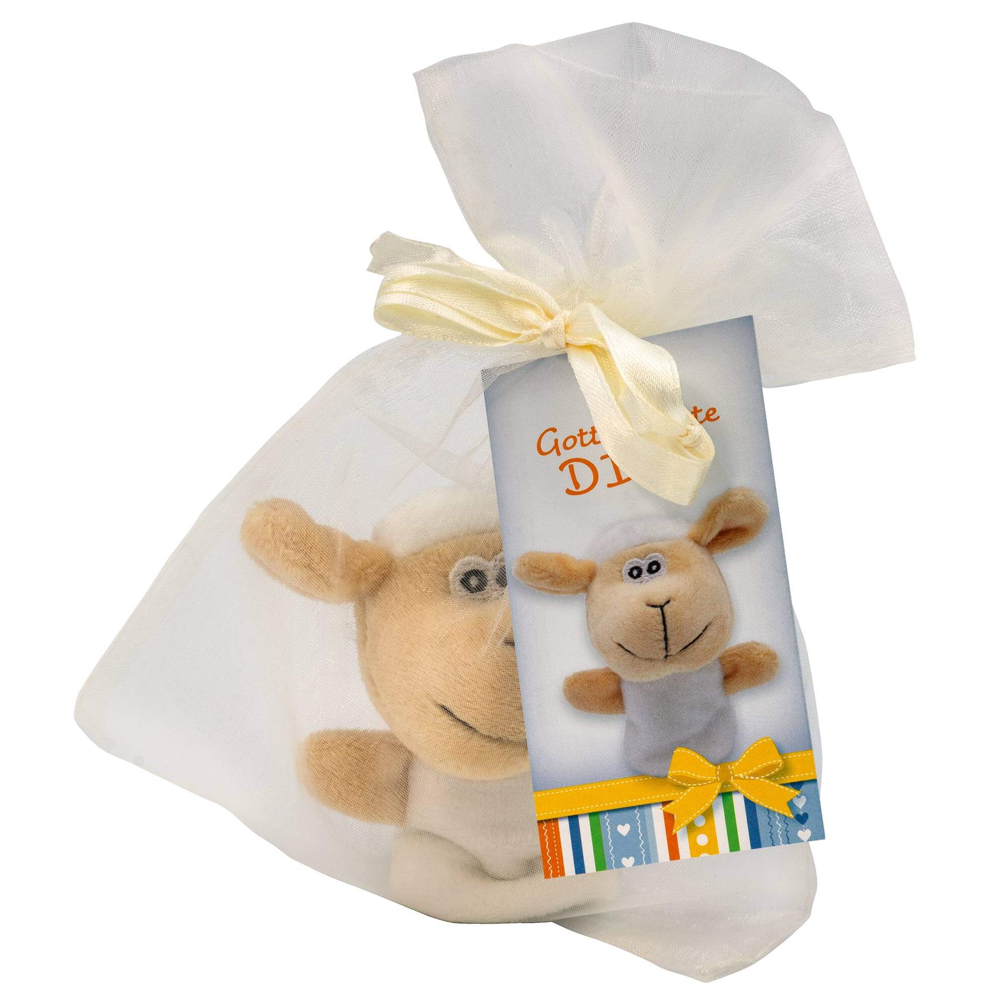 Hübsch verpackt ist die kleine Fingerpuppe im passenden Organzabeutel mit liebevoll gestaltetem Schmuckkärtchen und der Aussage "Gott behüte DICH".